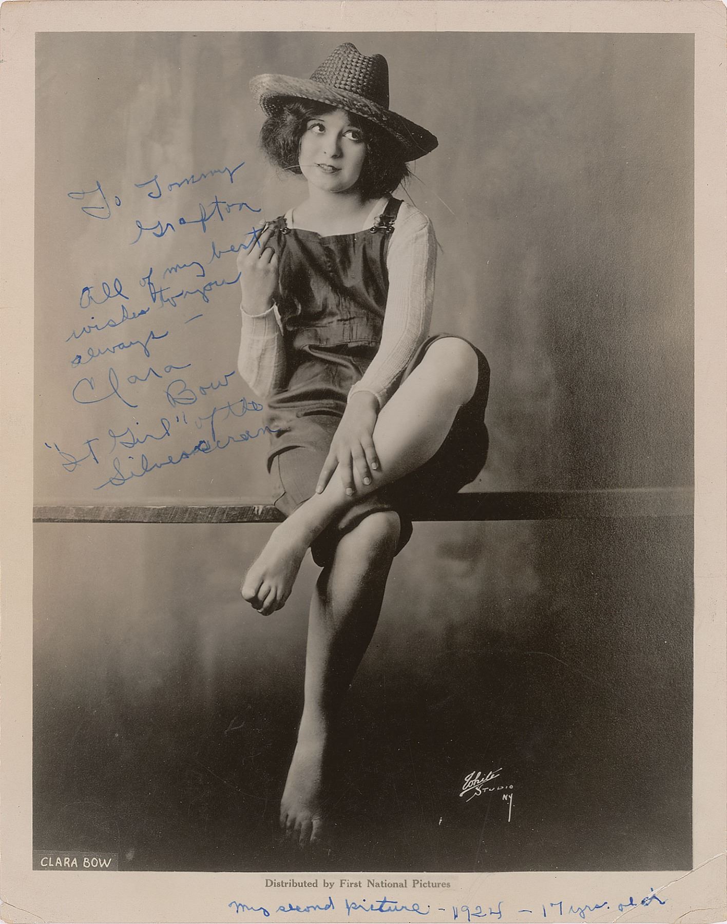 Glossy 8 x 10 First National Pictures publicity photo of Bow in a full-length pose, sitting on a plank and wearing overalls, signed and inscribed in blue fountain pen, "To Tommy Grafton, All of my best wishes to you always—Clara Bow, 'It Girl' of the Silver screen," with Bow adding in the lower border, "My second picture—1924—17 yrs. old.” In fine condition, with creases to corners (lower corners reinforced with archival tape on the reverse).