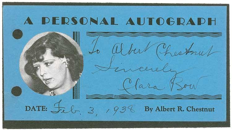 Vintage fountain pen signature and inscription, “To Albert Chestnut, Sincerely, Clara Bow, Feb 3, 1938,” on a 5.5 x 2.75 blue card from the Albert R. Chestnut collection. In fine condition, attached to a slightly larger black card, with a small photo attached to the left blank area. From his Pennsylvania home, Chestnut, a printer by profession, began collecting autographs in 1935. He sent these personally-printed cards to over a thousand celebrities and received favorable replies from the vast majority, finally retiring from collecting to raise his family when postage increased from 2¢ per card! Pre-certified PSA/DNA and RRAuction COA.