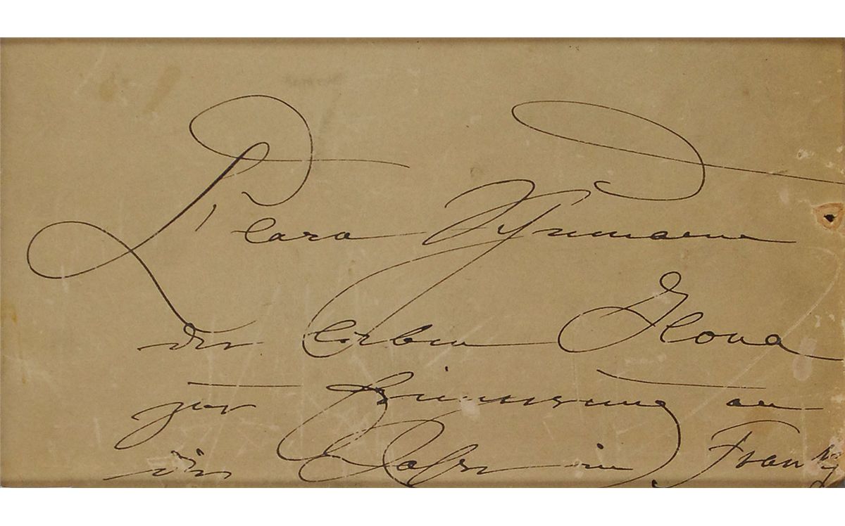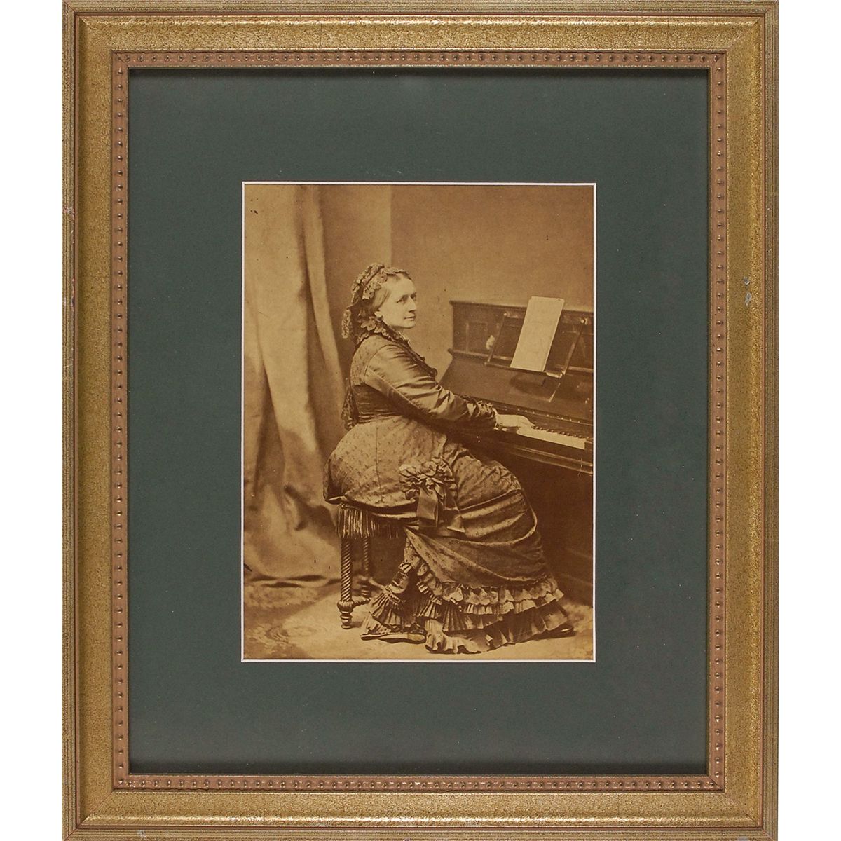 Composer and one of the most distinguished pianists of the Romantic era (1819–1896). She and her husband, composer Robert Schumann, were early champions of Johannes Brahms. Original mounted matte-finish 7 x 9.5 portrait of Schumann playing the piano, signed and inscribed on the reverse in black ink in German (translated), “Clara Schumann, to dear Ilona in memory of the years in Frankfurt.” Matted and framed to an overall size of 14 x 16.5, with a 6.25 x 3.5 window to the reverse for viewing of autograph. Scattered surface marks to reverse and a tack hole to right edge (visible on the reverse only), otherwise fine condition. Ilona Eibenschütz was an accomplished Hungarian pianist who studied under Schumann in Frankfurt from 1885 to 1890.