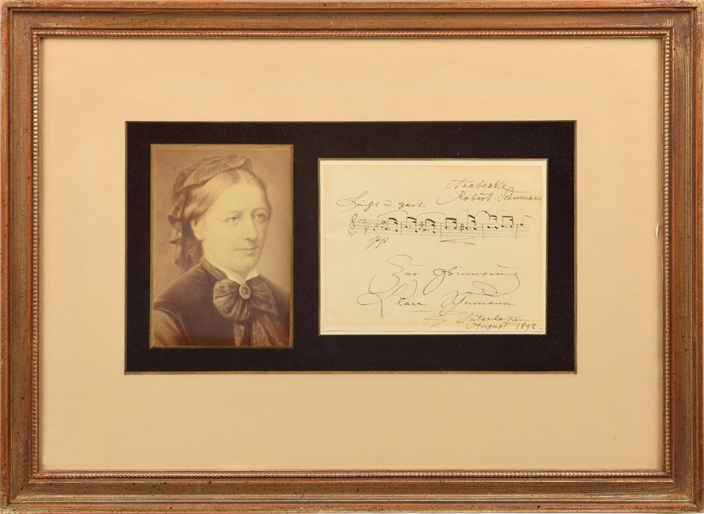 Composer and one of the most distinguished pianists of the Romantic era (1819–1896); she and her husband, composer Robert Schumann, were early champions of Johannes Brahms. Sought-after AMQS on an off-white 6 x 4.25 album page, signed at the bottom, "Clara Schumann," and dated August 1892. Schumann boldly pens five bars for piano from her husband's well-known 1839 piece "Arabeske," adding the title and his name, "Robert Schumann," in the upper right. Mounted, matted, and framed with a portrait to an overall size of 18.5 x 13.5. In fine condition, with a central vertical fold and a light block of toning from prior display.