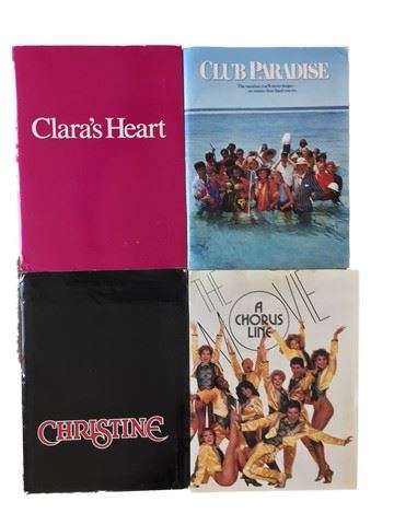 Collection of 4 press kits with black and white publicity stills included, sized mainly 8x10's (1980's) from various movie studios. From Warner Brothers "Clara's Heart" (1988) starring Whoopi Goldberg as Clara Mayfield, Michael Onkean as Bill Hart, and Kathleen Quinlan as Leona Hart, includes 4 stills. From Warner Brothers "Club Paradise" (1986) starring Robin Williams as Jack Moniker, Peter O' Toole as Governor, and Rick Moranis as Barry Nye, includes 4 stills. From Columbia Pictures "Christine" (1983) Keith Gordon as Arnie Cunninham, John Stockwell as Dennis Guilder, and Alexander Paul as Leigh Cabot, includes 11 stills. From Embassy Films Associations "The Movie A Chorus Line" (1985) starring Michael Douglas as Zach, Alyson Reed as Cassie, and Terrence Mann as Larry, includes 19 stills.