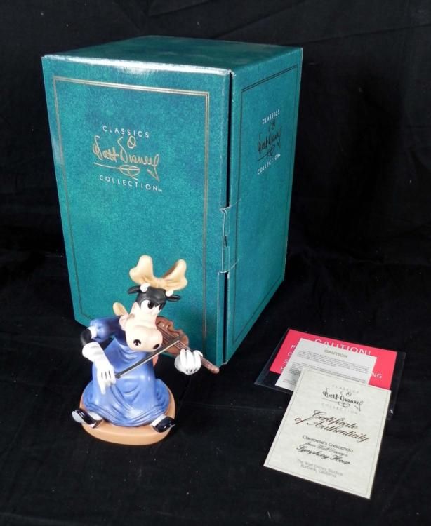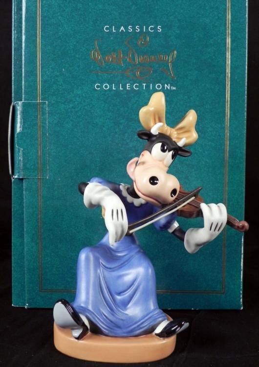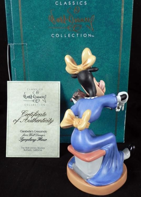 Clarabelle the cow is playing a tune on the fiddle, building up to a grand finale. The 7" tall resin figure was designed by Disney artists, and hand crafted with loving detail. It was created in 1994 exclusively for members of the Walt Disney Collectors Society, in the Symphony Hour series, part of their Classics Collection. It is now available here in mint condition in the original box. Also included is a Certificate of Authenticity, and brochure. * Get ready for the symphony, and let's hear it for Clarabelle's Crescendo!