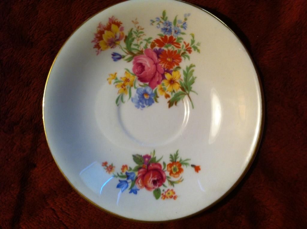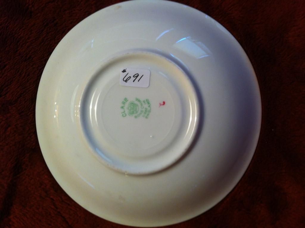 Clare, Bone China Made in England, Pattern #596, with colorful flowers and gold trim saucer, approximately 5.5" in diameter. Crown stamp.