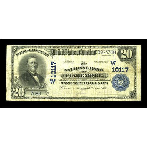 <B>Claremore, OK</B></I> - $20 1902 Plain Back Fr. 654 <B>The NB of Claremore</B></I> Ch. # (W)10117<BR>Seven large notes are reported in Kelly from here, which is also known as the home of Will Rogers. This <B>Fine</B></I> example last appeared in a CAA auction May of 2000.<BR><BR><b>Shipping:</b> Coins & Currency (<a target="_blank" href="http://www.heritageauctions.com/common/shipping.php">view shipping information</a>)