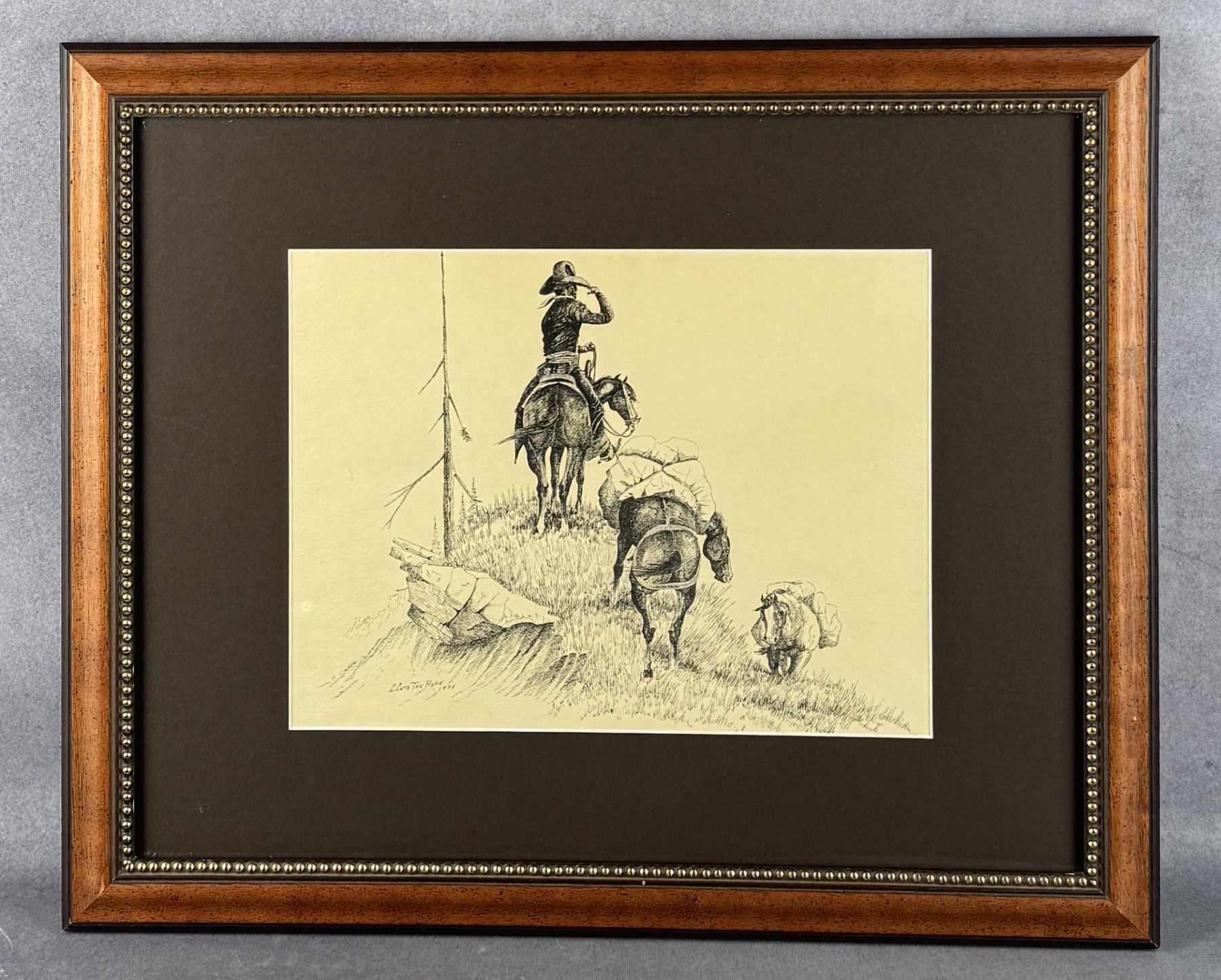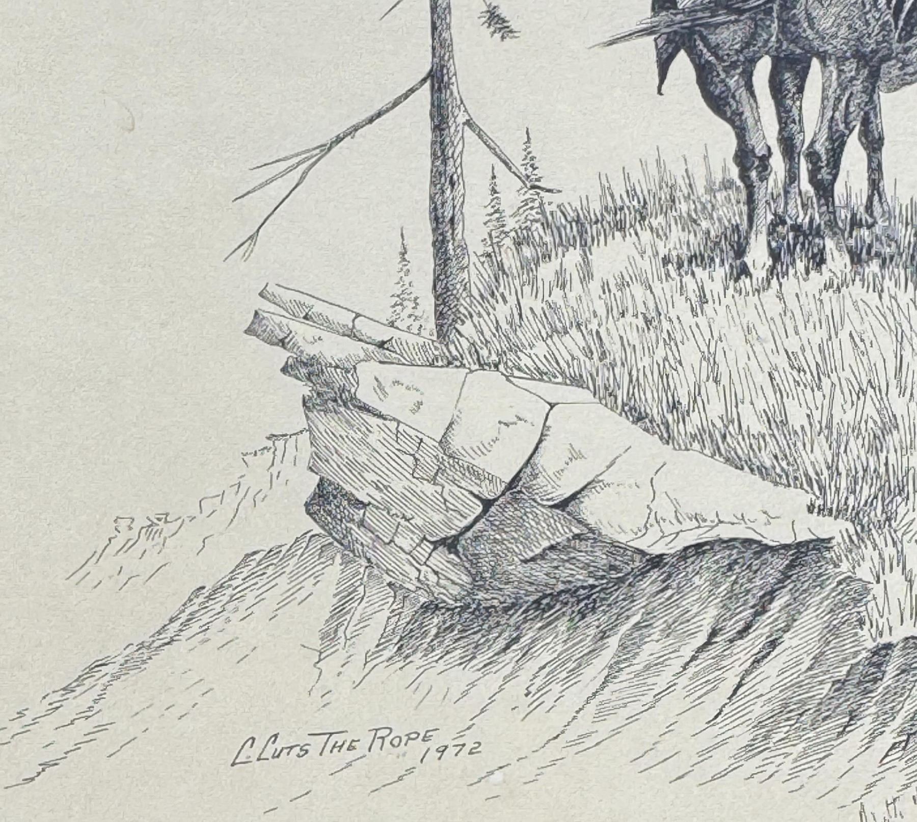 18 5/8" by 22 3/4" framed. Pen and Ink. Clarence Basil Cuts the Rope (1935 - 2000) was active/lived in Montana. Clarence Cuts the Rope is known for Native American, landscape painting. Excerpts from a Blaine County Journal Article by Steve Edwards published on May 24, 2017 Wells Fargo asked to donate Cuts The Rope painting to Hays center A number of locals, including the son of famed Hays-based artist Clarence Cuts The Rope, have asked Wells Fargo executives to donate a large painting, done by Cuts The Rope, to be hung in the new Hays community center when it is completed. The painting was one of two commissioned by the bank in 1982 (it was Bank of Montana at that time). Clarence Cuts The Rope died in 2000. Ada Brekke, of Chinook, was a bank employee at the time. She said, "Clarence did two paintings, one of a buffalo hunt, and the other a winter scene set in Mission Canyon. Because there wasn't room for both painting to be displayed on the ground floor, the hunting scene went upstairs and the winter scene was hung on the east wall of the main lobby." The winter scene was still there when the branch closed last week. Brekke said in the early 1990's a bank manager asked Clarence Cuts The Rope if he would trade the painting of the buffalo hunt for two smaller paintings that could be hung in the manager's office on the ground floor. Clarence agreed and the painting of the hunt was taken to be displayed in a tribal building at the Fort Belknap Agency. Two smaller paintings were still in the manager's office when the branch closed. Clarence's son, Catcher Cuts The Rope, heard of the branch closing and began efforts to keep the winter scene painting in Blaine County. He believed, "When bank officials were discussing the closing of the Chinook branch they weren't thinking about what they would do with the large winter painting in the lobby." Tara Overcast, the Lead Teller who had been overseeing the branch for the last few months it operated, said she understood that there were plans to crate the painting and send it to St. Louis for storage. Brekke and other locals got involved in the effort to help Catcher keep the painting in the area.