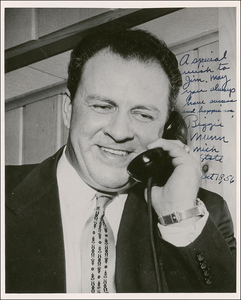 College Football Hall of Fame coach (1908–1975). Vintage glossy 8 x 10 photo, signed and inscribed in fountain pen “A special wish to Jim. May you always have success and happiness. ‘Biggie’ Munn, Mich. State, Oct. 18, 56.” Some light edge curling and slight traces of an unsuccessful first attempt of inscription in blue ballpoint, otherwise fine condition.