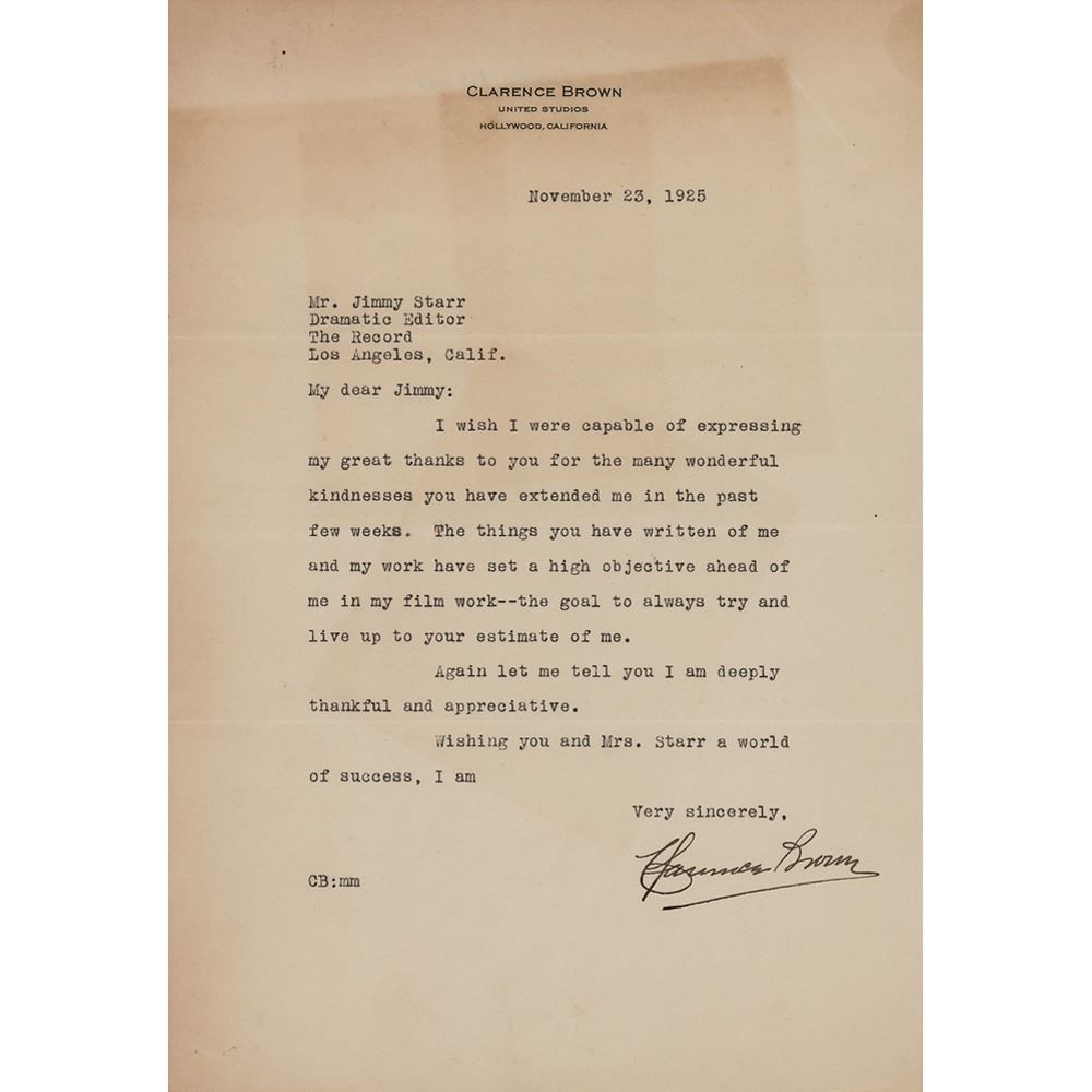 Prolific 'Golden Age' film director (1890–1987) known for such classics as Anna Christie, Anna Karenina, National Velvet, and The Yearling; he directed Joan Crawford in six films, and Greta Garbo in seven. TLS, one page, 7.25 x 10.5, personal letterhead, November 23, 1925. Letter to columnist Jimmy Starr, in part: "I wish I were capable of expressing my great thanks to you for the many wonderful kindnesses you have extended me in the past few weeks. The things you have written of me and my work have set a high objective ahead of me in my film work—the goal to always try and live up to your estimate of me." In fine condition, with slightly irregular toning. This letter dates to two weeks after the premiere of The Eagle, directed by Brown and starring Rudolph Valentino.