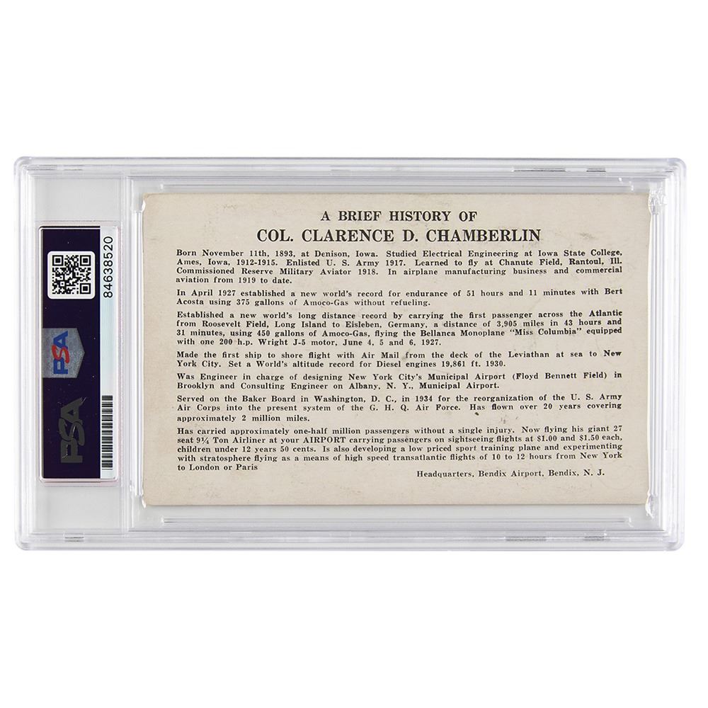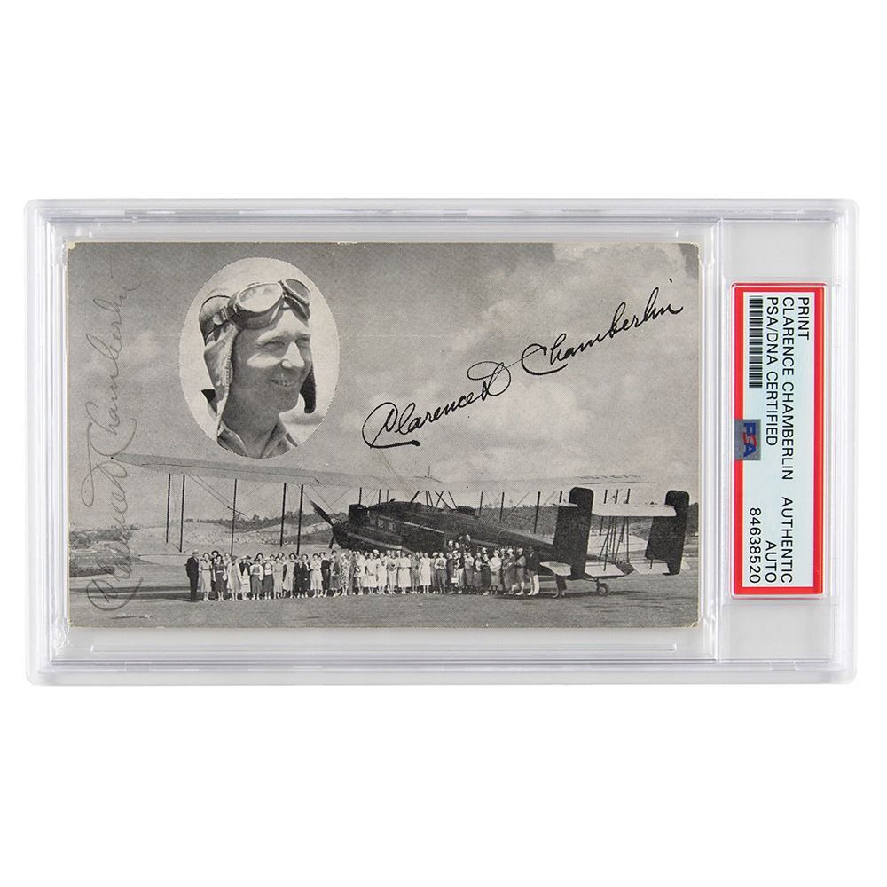 Vintage 5.5 x 3.25 promotional photo card of a large group of people lined in front of a Curtis T-32 Condor biplane, with an inset oval portrait of pilot Clarence Chamberlin to the upper left, signed vertically in pencil, "Clarence D. Chamberlin." The card also bears a facsimile autograph in black. In fine condition. Encapsulated in a PSA/DNA authentication holder.