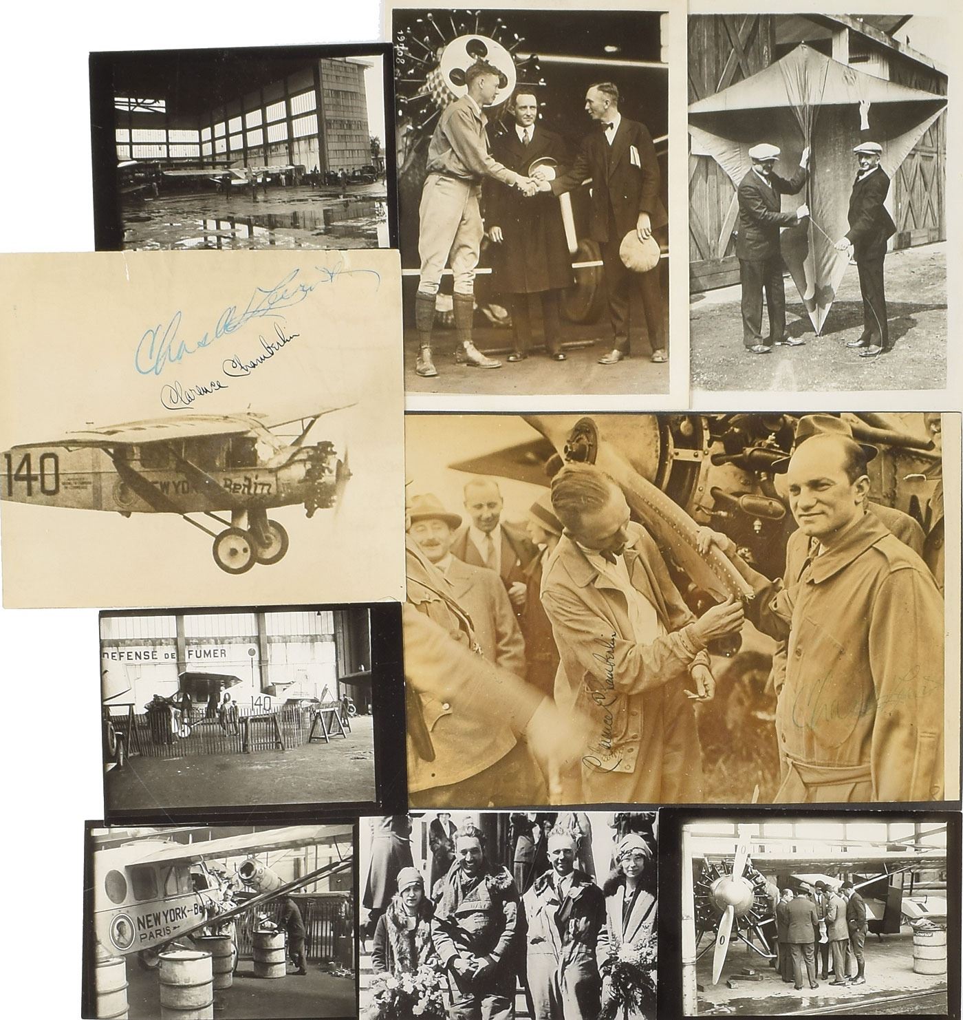 Unusual collection of photographs associated with aviation pioneer Clarence Chamberlin and his famous passenger Charles A. Levine, who he took on the first transatlantic passenger flight in 1927 aboard his plane 'The Columbia.' Includes: a vintage glossy 6.75 x 6 photo of 'The Columbia' in flight from New York to Berlin, signed in fountain pen, "Clarence Chamberlin" and "Chas. A. Levine"; a vintage glossy 9.5 x 6.5 of the pair examining the plane's damaged propellor, signed in fountain pen, "Clarence Chamberlin" and "Chas A. Levine"; four original vintage 5 x 3.5 photographs of Chamberlin and Levine at Le Bourget, Paris on June 30, 1927; an original vintage 5 x 7 photograph of Chamberlin and Lloyd W. Bertaud holding a large kite; an original vintage 5 x 7 photograph of Charles Lindbergh shaking hands with Chamberlin; and an original vintage glossy 5.5 x 3.5 photo of Chamberlin winning a prize. In very good to fine condition, with moderate overall creasing, trimmed edges, and a few edge tears to the signed photos.