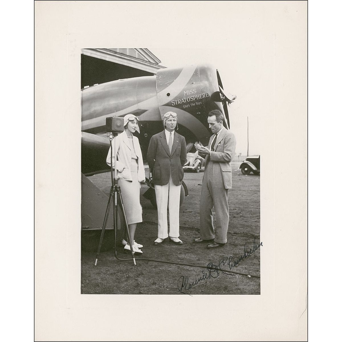 Aviator (1893–1976) who distinguished himself as the second pilot to fly a fixed-wing plane across the Atlantic Ocean, and the first to accomplish it with a transatlantic passenger. Vintage matte-finish 8 x 9.75 photo of Chamberlin standing next to the plane, Miss Stratosphere, signed in black felt tip. In fine condition, with light creasing to the bottom right corner.