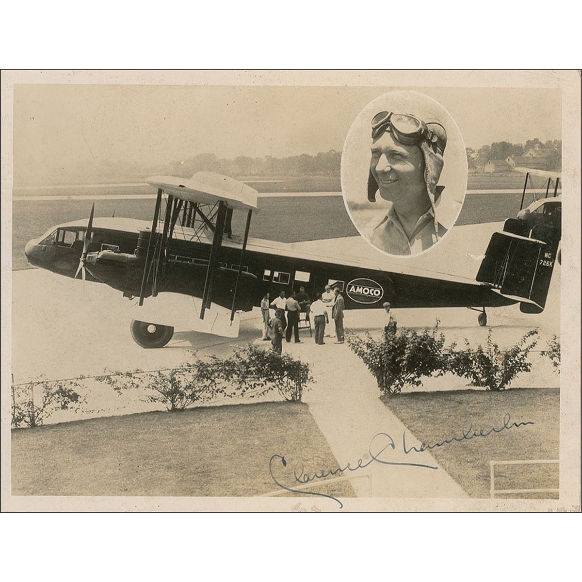 Vintage pearl-finish 8.5 x 6.5 composite photo of an oval portrait of Chamberlain set over his plane, signed in fountain pen, “Clarence Chamberlain.” In very good condition, with some light creases, one of which affects the first name of the signature, a few small areas of surface loss, light toning and areas of soiling around the edges, light silvering to the darker areas of the image, and surface loss on the reverse.