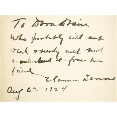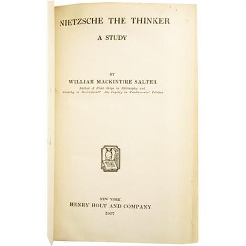 <B>Clarence Darrow Inscribed Copy of <I>Nietzsche the Thinker</B></I></B></I> by William Mackintire Salter (New York: Henry Holt & Company, 1917), first edition, 539 pages, dark green cloth with gilt titles, 8vo (5.75" x 8.5"). Inscribed and signed "<I>To Dora, who probably will not read & surely will not understand it - from her friend Clarence Darrow</B></I>" on the front free endpaper. In 1924, Darrow defended accused murderers Leopold and Loeb, who were later convicted of the crime they committed just to see what it was like to take a human life. Darrow convinced his clients to plead guilty and won them life in prison instead of the death penalty. In their defense, Darrow argued that Leopold and Loeb were not completely responsible for their actions, but that their minds had been twisted by the <I>Übermensch,</B></I> or superman, ideal, learned in their study of the existential philosophy of Frederick Nietzsche. This book was signed by Darrow in the year that he used this defense in the trial of Leopold and Loeb. The book is in good condition, with moderate shelf wear, bumped corners, and a faded spine. The connection between Darrow, Nietzsche, and Leopold and Loeb, however, is irresistible for the book collector interested in historical association copies.<BR><BR><b>Shipping:</b> Books & Catalogs (<a target="_blank" href="http://www.heritageauctions.com/common/shipping.php">view shipping information</a>)
