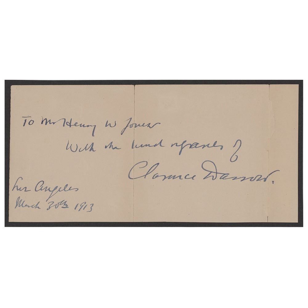 Ink signature, "To Mr. Henry W. Jones with the kind regards of Clarence Darrow, Los Angeles, March 30th 1913," on an off-white 9 x 5.5 sheet. In very good to fine condition, with two separations to the two vertical folds repaired on the back, and a tear to the top center which could be matted out.