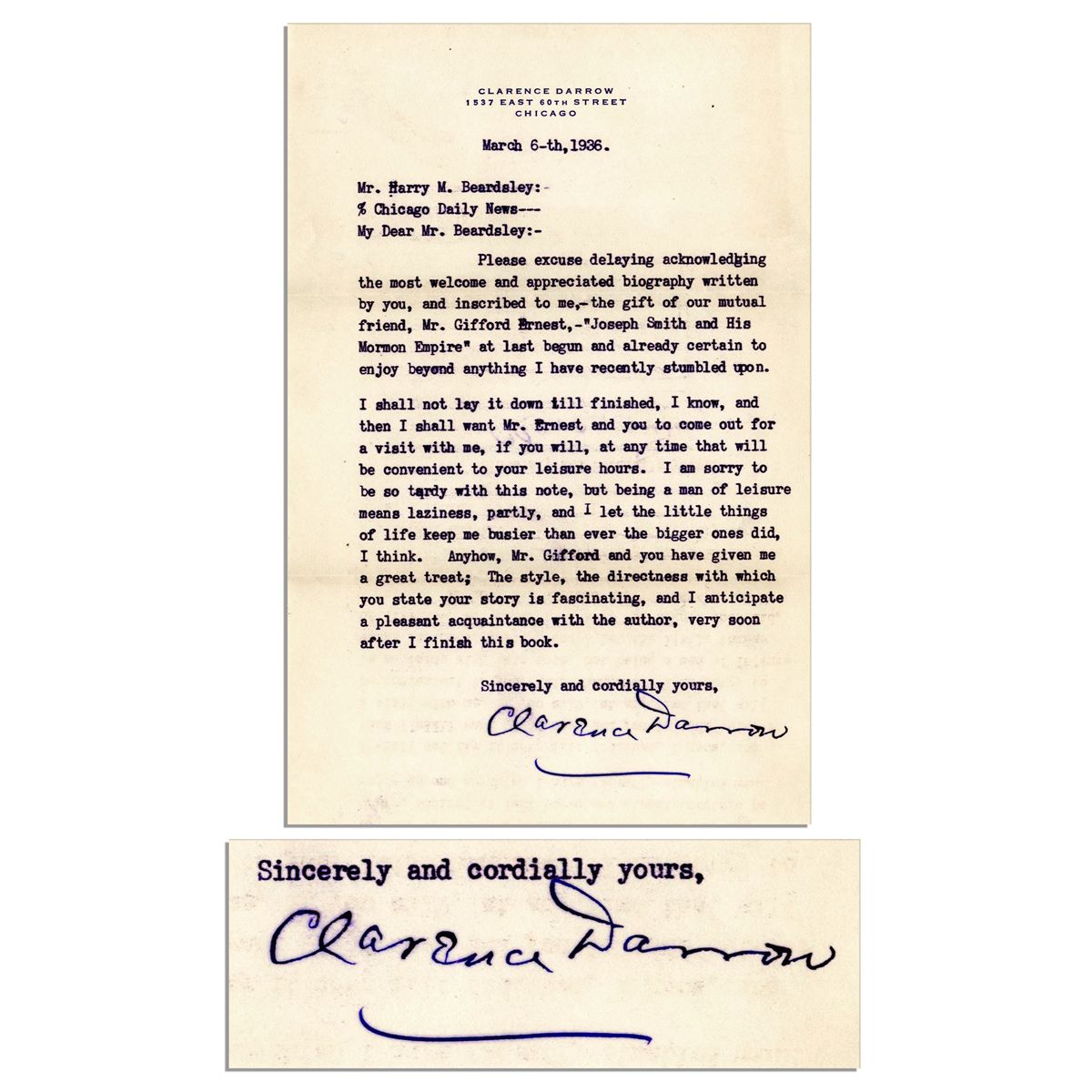 Clarence Darrow typed letter signed. Upon his personal stationery, Darrow's letter to Mr. Harry M. Beardsley, in care of the Chicago Daily News is dated 6 March 1936, two years before his death. Letter reads in full, ''Please excuse delaying acknowledging the most welcome and appreciated biography written by you, and inscribed to me, - the gift of our mutual friend, Mr. Gifford Ernest, - 'Joseph Smith and His Mormon Empire' at last begun and already certain to enjoy beyond anything I have recently stumbled upon. I shall not lay it down till finished, I know, and then I shall want Mr. Ernest and you to come out for a visit with me, if you will, at any time that will be convenient to your leisure hours. I am sorry to be so tardy with this note, but being a man of leisure means laziness, partly, and I let the little things of life keep me busier than ever the bigger ones did, I think. Anyhow, Mr. Gifford and you have given me a great treat; The style, the directness with which you state your story is fascinating, and I anticipate a pleasant acquaintance with the author, very soon after I finish this book. Sincerely and cordially yours, [signed] Clarence Darrow''. Single-page letter measures 6.75'' x 10.25''. Typed in purple on purple embossed stationery and also signed in purple ink. Creasing, else near fine.