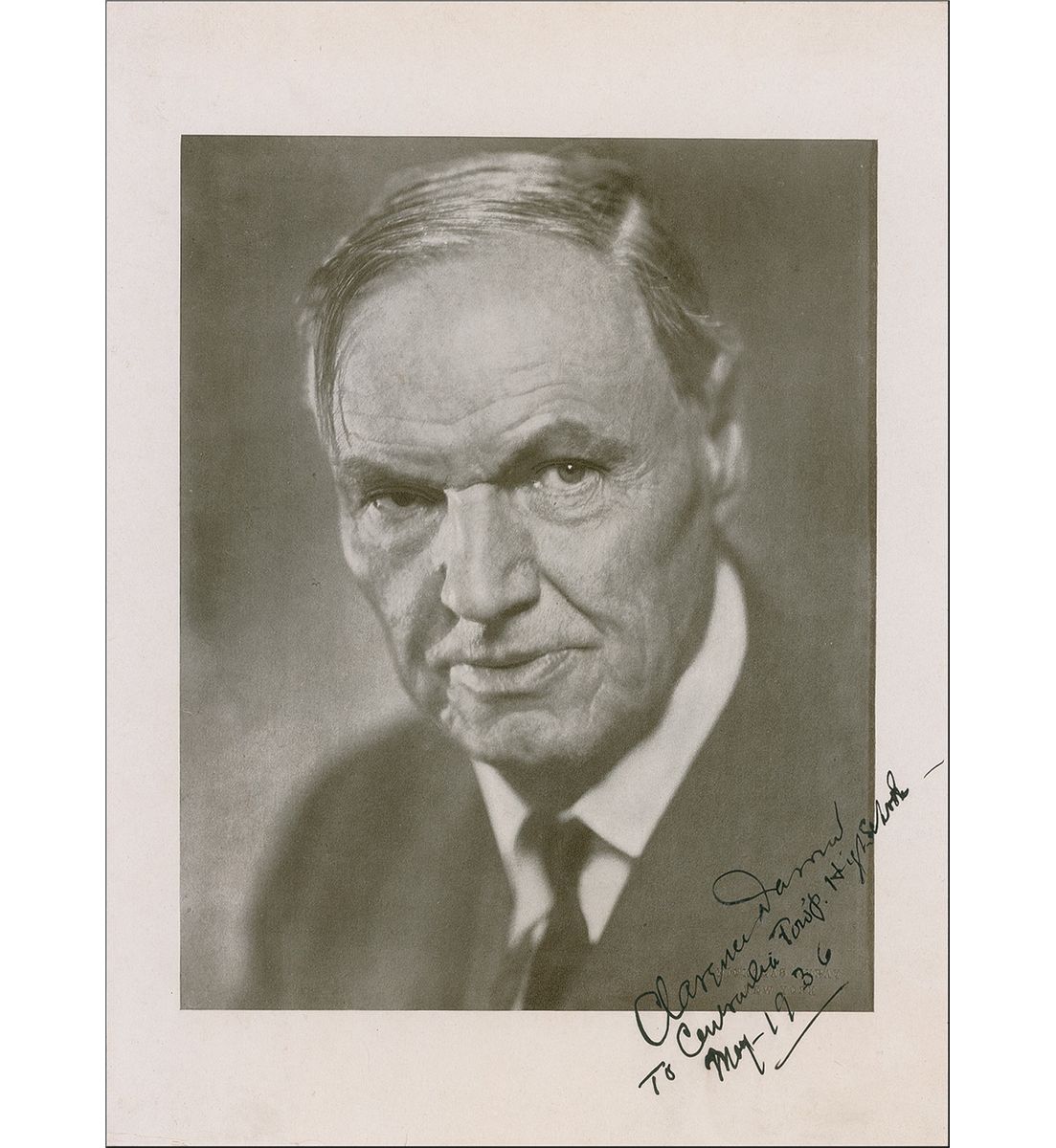 Brilliant defense attorney (1857–1938) noted for his role in the Scopes ‘Monkey’ Trial and the Leopold-Loeb thrill-killing case. Uncommon vintage 9 x 12.25 paperstock head-and-shoulders photo, signed and inscribed in fountain pen “Clarence Darrow to Columbia Tow’p High School, May 1936.” Some scattered edge creases and some mild toning to borders, otherwise fine condition.