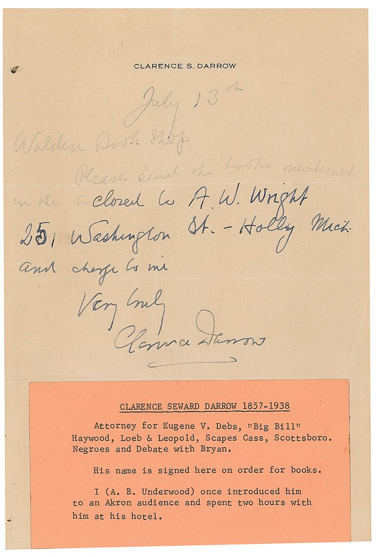 Brilliant defense attorney (1857–1938) noted for his role in the Scopes ‘Monkey’ Trial and the Leopold-Loeb thrill-killing case. ALS, one page, 5.75 x 8.5, July 13. Darrow writes Walden Book Shop regarding an order. In full: “Please send the books mentioned in the enclosed to A. W. Wright, 251 Washington St., Holly Mich. and charge to me.” Mounted on a slightly larger heavy board with informational swatch glued to front, not affecting text or signature. In very good condition, with the ink in the first half of the letter very light, a new pen being employed to finish the letter, resulting in a bold signature, intersecting folds, and a paperclip impression to top edge.