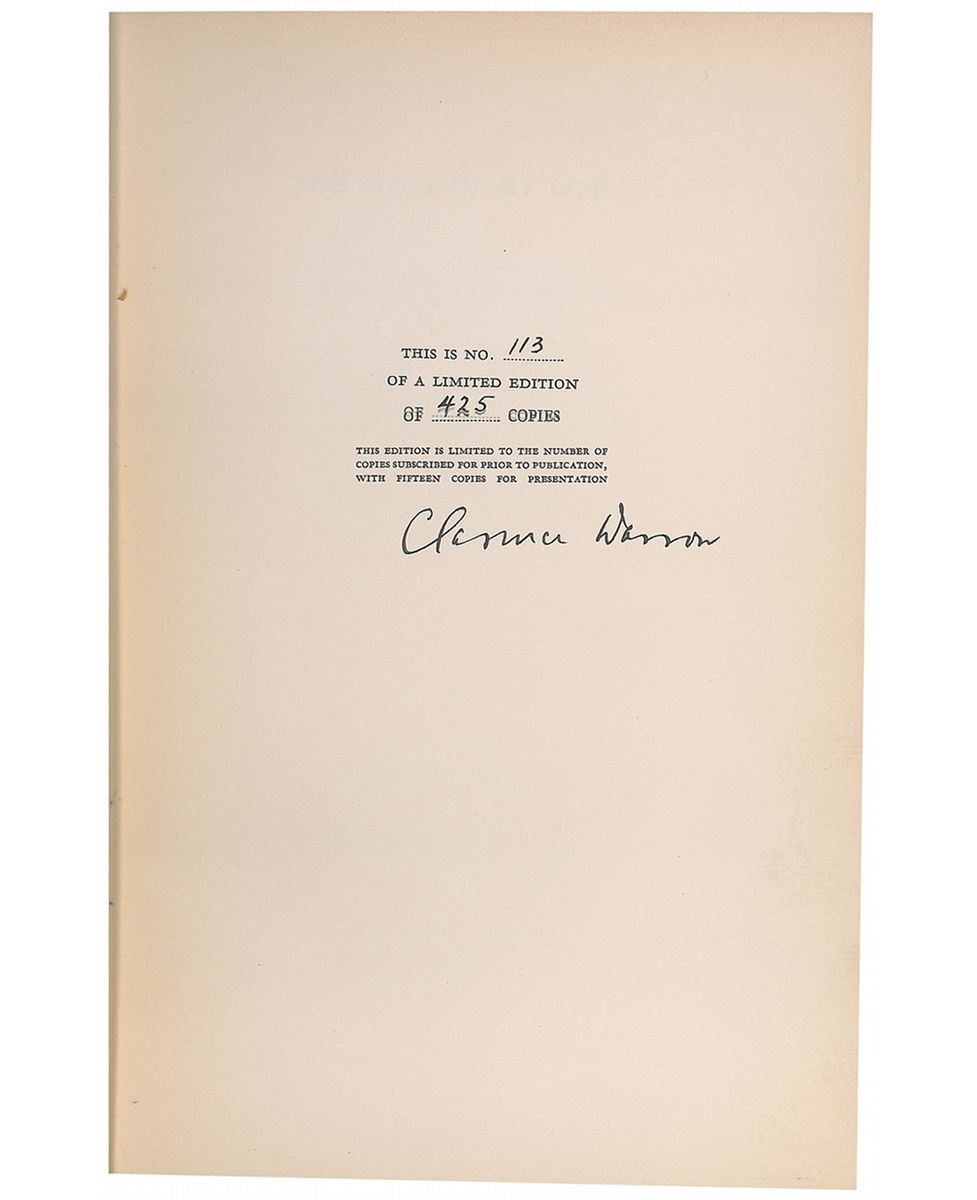Brilliant defense attorney (1857–1938) noted for his role in the Scopes ‘Monkey’ Trial and the Leopold-Loeb thrill-killing case. Signed book: The Story of My Life. Limited edition of 425 copies (This being No. 113). NY: Charles Scribner's Sons, 1932. Hardcover, 6.5 x 9.75, 465 pages. Signed on the limitations page in black ink. Book condition: VG/None. Cream cloth-covered boards; spine sunned; discoloration and soiling to exterior including a small red splotch to rear; one interior hinge has minor crack, but binding still feels strong. A boldly signed and quite rare example from the litigator who championed the cause of the underdog.