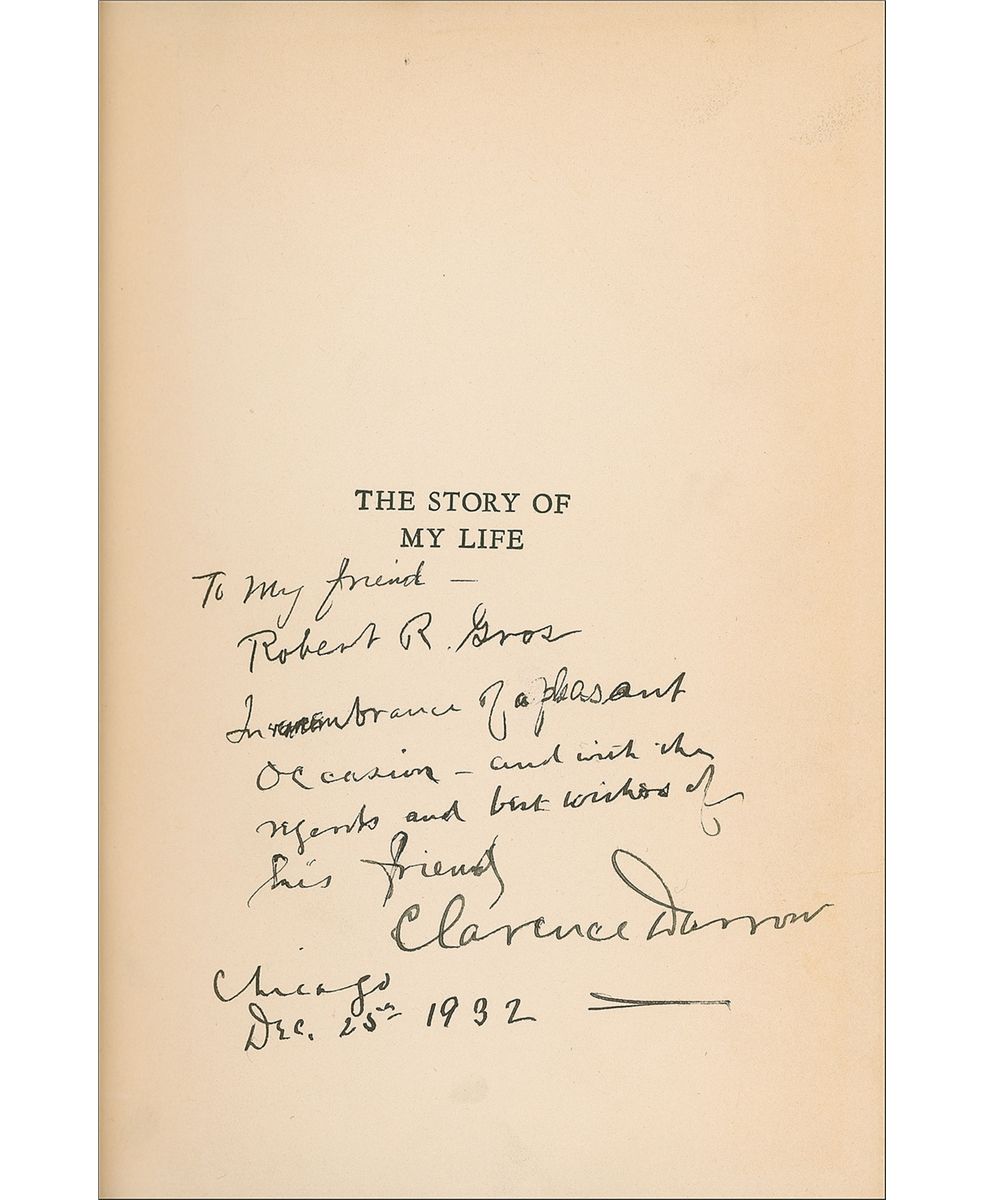 Signed book: The Story of My Life. First edition. NY: Charles Scribner’s Son, 1932. Hardcover, 5.5 x 8.25, 487 pages. Signed and inscribed in black ink on the half-title page, “To my friend, Robert R. Gros, In remembrance of a pleasant occasion—and with the regards and best wishes of his friend, Clarence Darrow. Chicago, Dec. 25, 1932.” Light page toning and foxing to a few back pages, former owner’s label affixed to the front board, light cover wear and sunning to the spine, otherwise fine condition. Accompanied by a vintage, unsigned 4.25 x 3.5 photo of Darrow and an unidentified man.