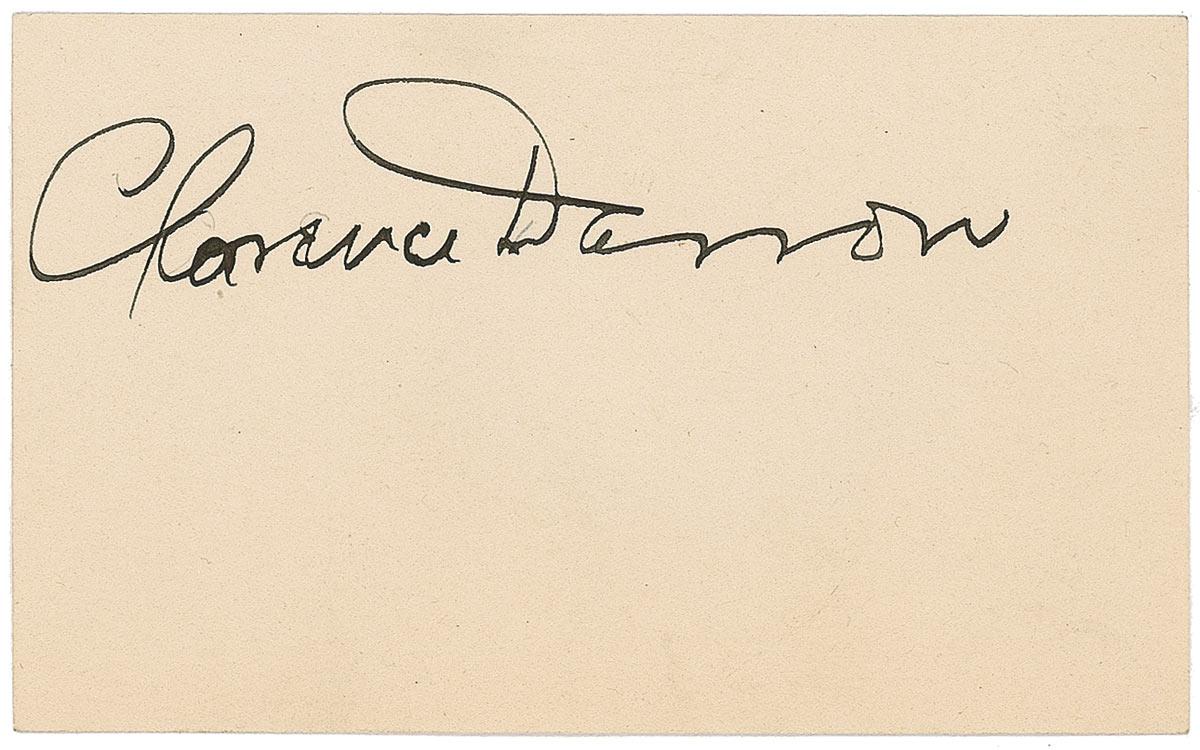 Brilliant defense attorney (1857–1938) noted for his role in the Scopes “Monkey” Trial and the Leopold-Loeb thrill-killing case. Ink signature, “Clarence Darrow,” on an off-white 3.5 x 2.25 card. In fine condition, with a mild overall shade of toning, and mounting remnants on reverse. Pre-certified PSA/DNA and RRAuction COA.