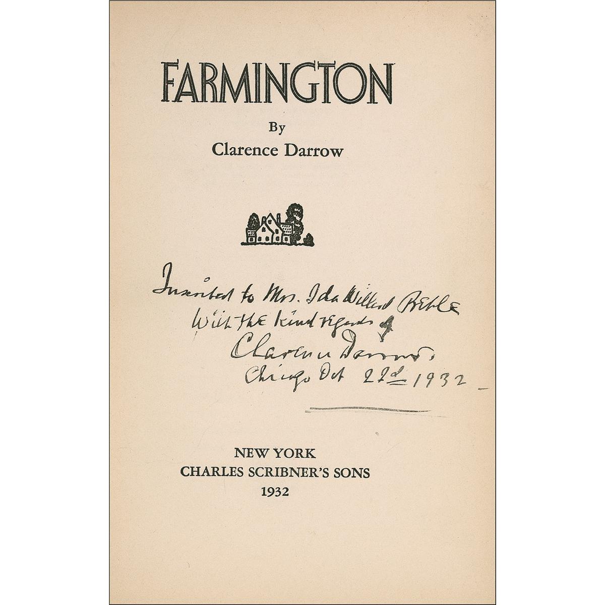 Brilliant defense attorney (1857–1938) noted for his role in the Scopes “Monkey” Trial and the Leopold-Loeb thrill-killing case. Signed book: Farmington. Later printing. NY: Charles Scribner's Sons, 1932. Hardcover with dustjacket, 6 x 8.25, 255 pages. Signed and inscribed on the title page “Inscribed to Mrs. Ida Willard Beble, with the kind regards of Clarence Darrow, Chicago, Oct. 22nd 1932.” A mild shade of edge toning to signed page, as well as both pastedowns, and some light wear to spine and covers, otherwise fine condition. Dustjacket rates very good, with mild toning, sunning to spine, and edge wear and tears.