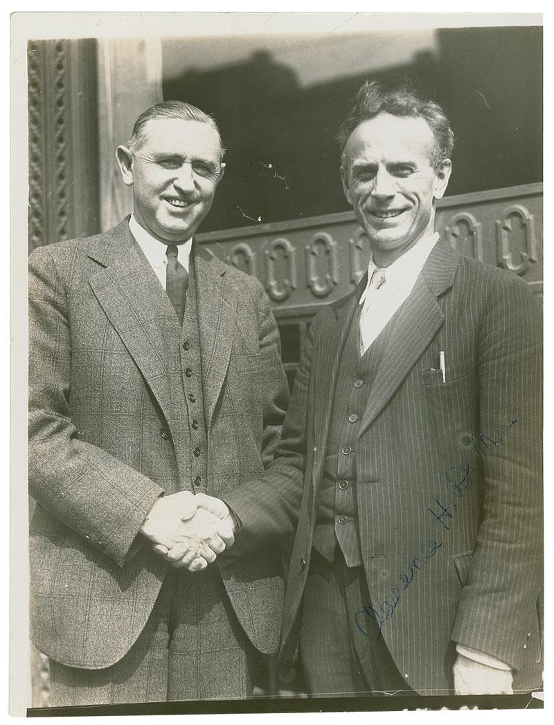 Marathoner (1888–1958) and winner of seven Boston Marathons. Glossy 6 x 7.75 photo of DeMar shaking hands with another man, signed in blue ballpoint. In very good condition, with trimmed edges, skipping to signature, scattered creases and surface marks, and DeMar signing over an unsuccessful first attempt.
