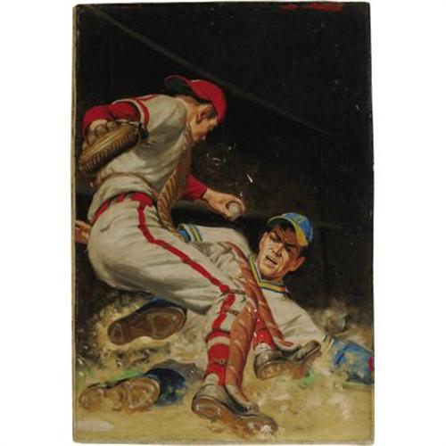 <B>Clarence Doore (attributed) - Baseball Home Plate Painting Original Art (undated).</B></I> The dramatic tension of a ball player sliding home is captured in this action-packed painting. The image has the look and feel of a pulp cover, and this work was probably done for one of the many sports pulps, for a title such as <B>Complete Sports</B></I>, <B>Super Sports</B></I>, or <B>Baseball Stories</B></I>. The overall size of the painting measures 13" x 19". There are a few areas where the paint has flaked from the surface of the board, otherwise, the condition of the art is Good. "Beat the tag," and get your bid in early on this great painting. <BR><BR><b>Shipping:</b> Flat Material, Small (<a target="_blank" href="http://www.heritageauctions.com/common/shipping.php">view shipping information</a>)