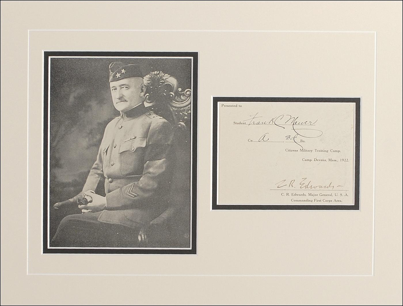 American general (1859–1931) known as the first Chief of the Bureau of Insular Affairs and for commanding the 26th Division in World War I. DS, signed “C. R. Edwards,” in his capacity as major general commanding the First Corps Area, one page, 5.25 x 4, 1922. In full: “Presented to Student Frank C. Mauer, Co. A, 3d Bn. Citizens Military Training Camp, Camp Devens, Mass., 1922.” Double matted with a small portrait to an overall size of 16 x 12. In fine condition, with scattered soiling.