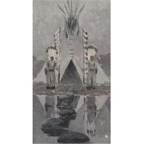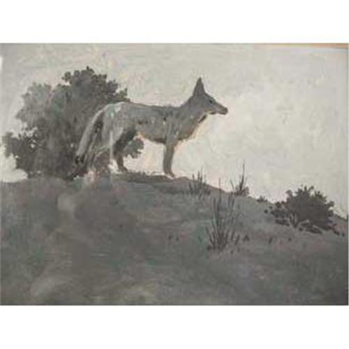 Clarence Ellsworth (1885-1961), Monotone, 3 Views, Coyote, Tee Pee, Hunter, Framed 9 1/4" x 18". Provenance: Iron Eyes Cody Estate.