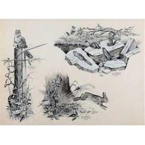 Clarence Ellsworth (1885-1961), Monotone, 1926, 3 Views, Chipmunks, Rabbits, 14 3/4" x 19", Signed under each view. Provenance: Iron Eyes Cody Estate.