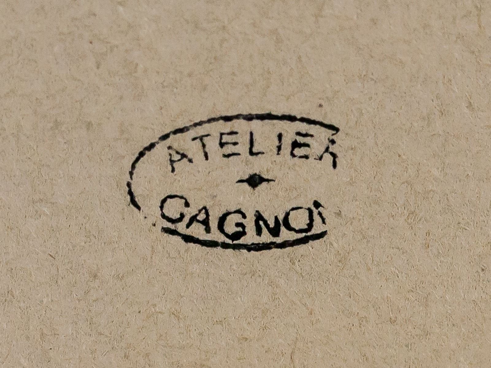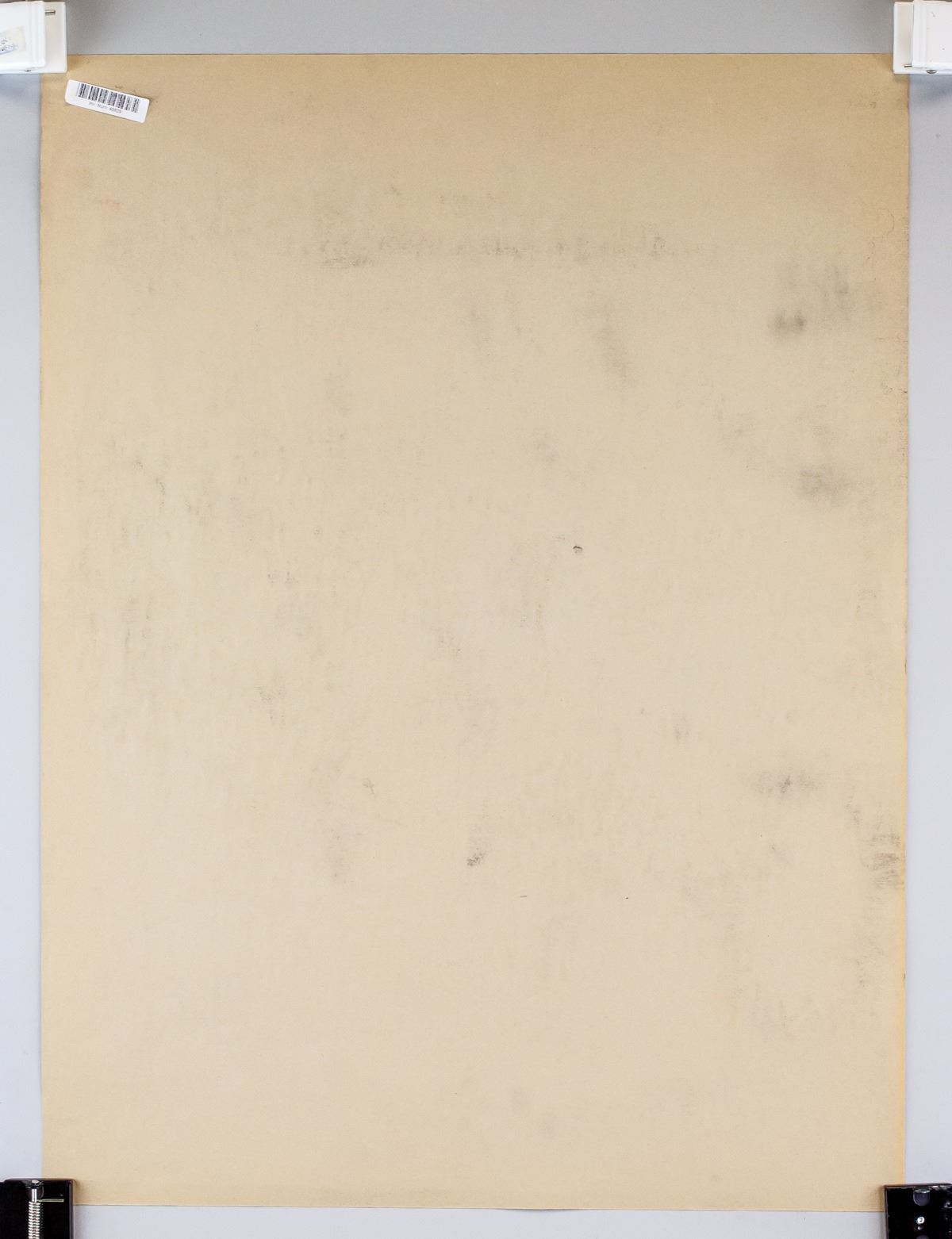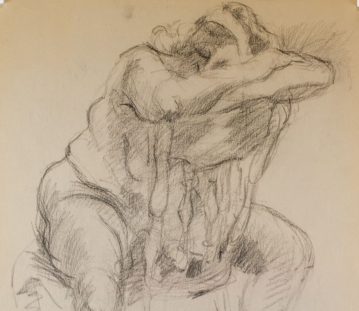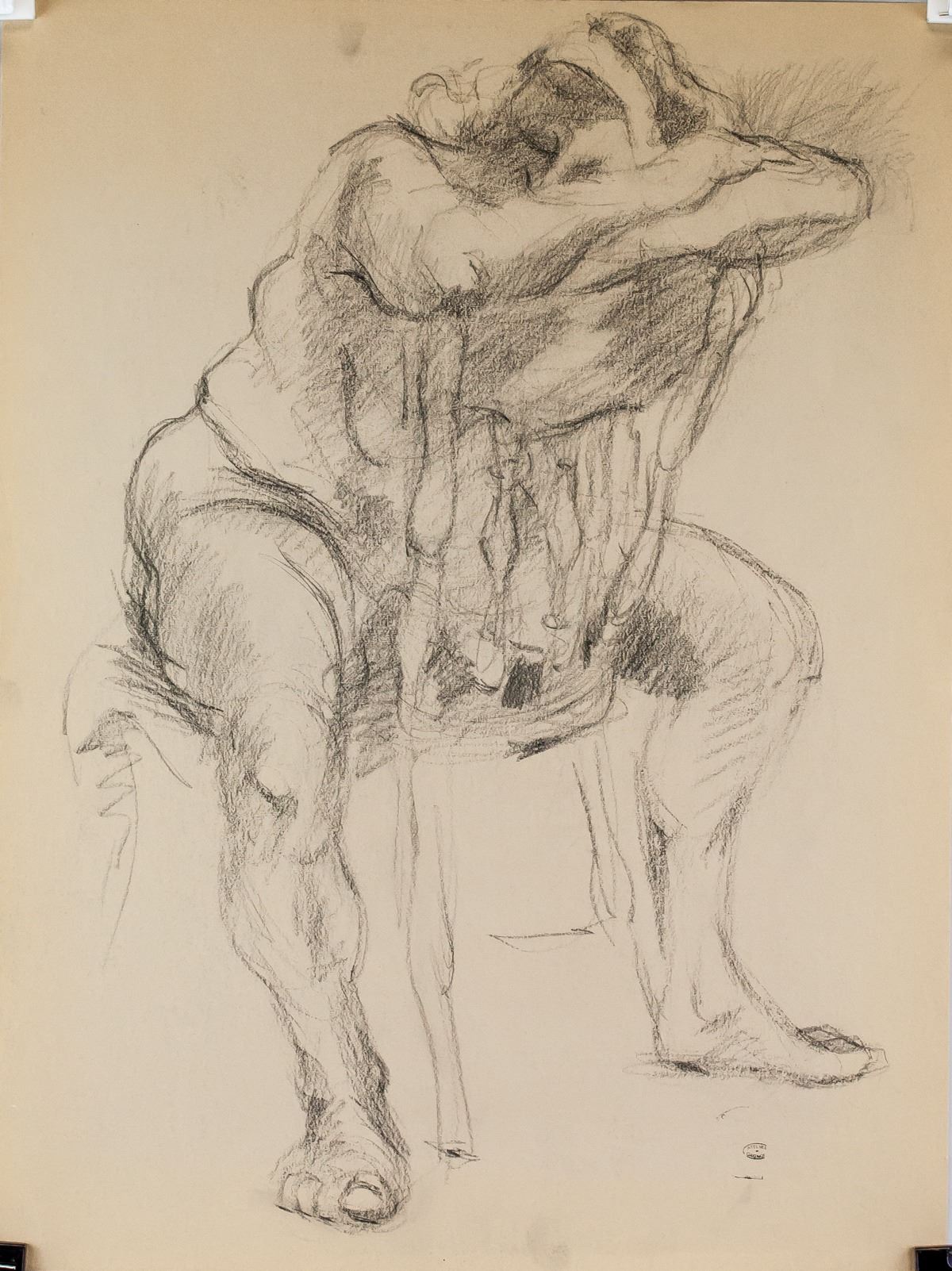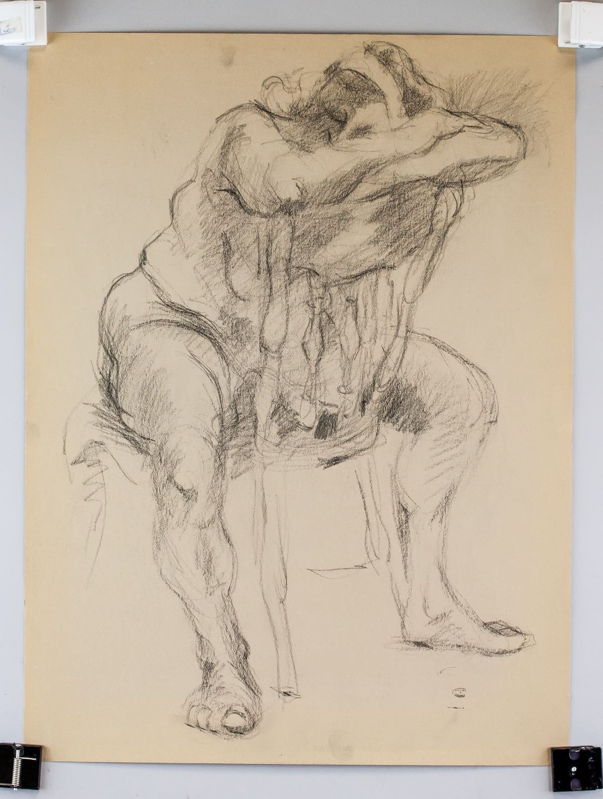 Charcoal on paper, unframed. Featuring a nude woman sitting in a chair backward while resting her head against her arms. Stamped with "Atelier Gagnon" near bottom right. Attributed to Clarence Gagnon (1881-1942, French-Canadian). 61 x 46 cm (24 x 18.1 in)