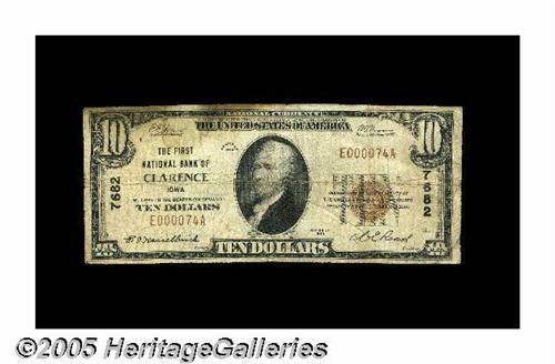 <B>Clarence, IA</B></I> - $10 1929 Ty. 1 <B>The First NB</B></I> Ch. # 7682<BR>We sold a VF Type 1 $20 from this institution in one of our Internet sales in May of 2000 for $525. This is a very tough bank with a scant five small size now documented. We expect this <B>Fine</B></I> example should reach roughly...