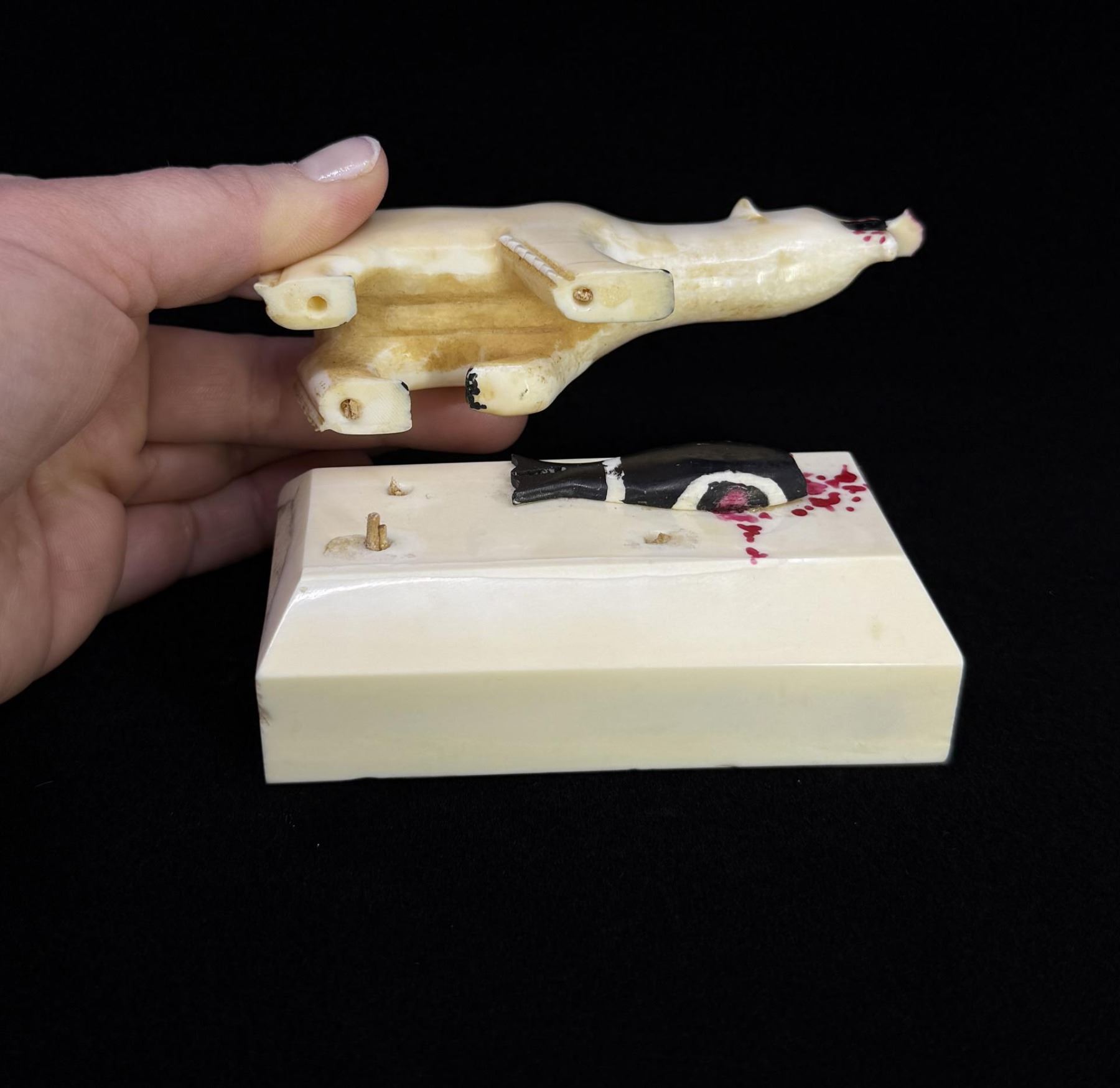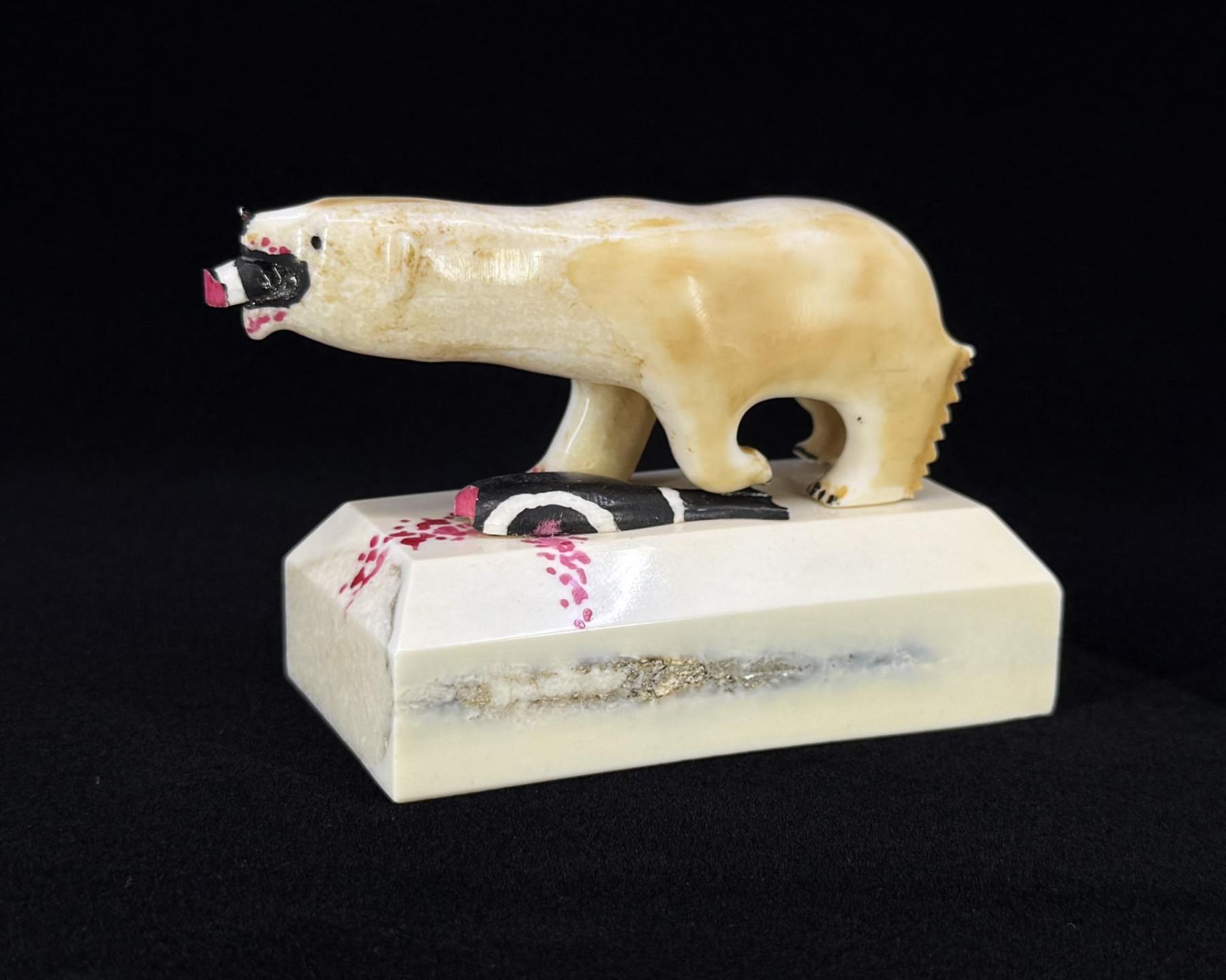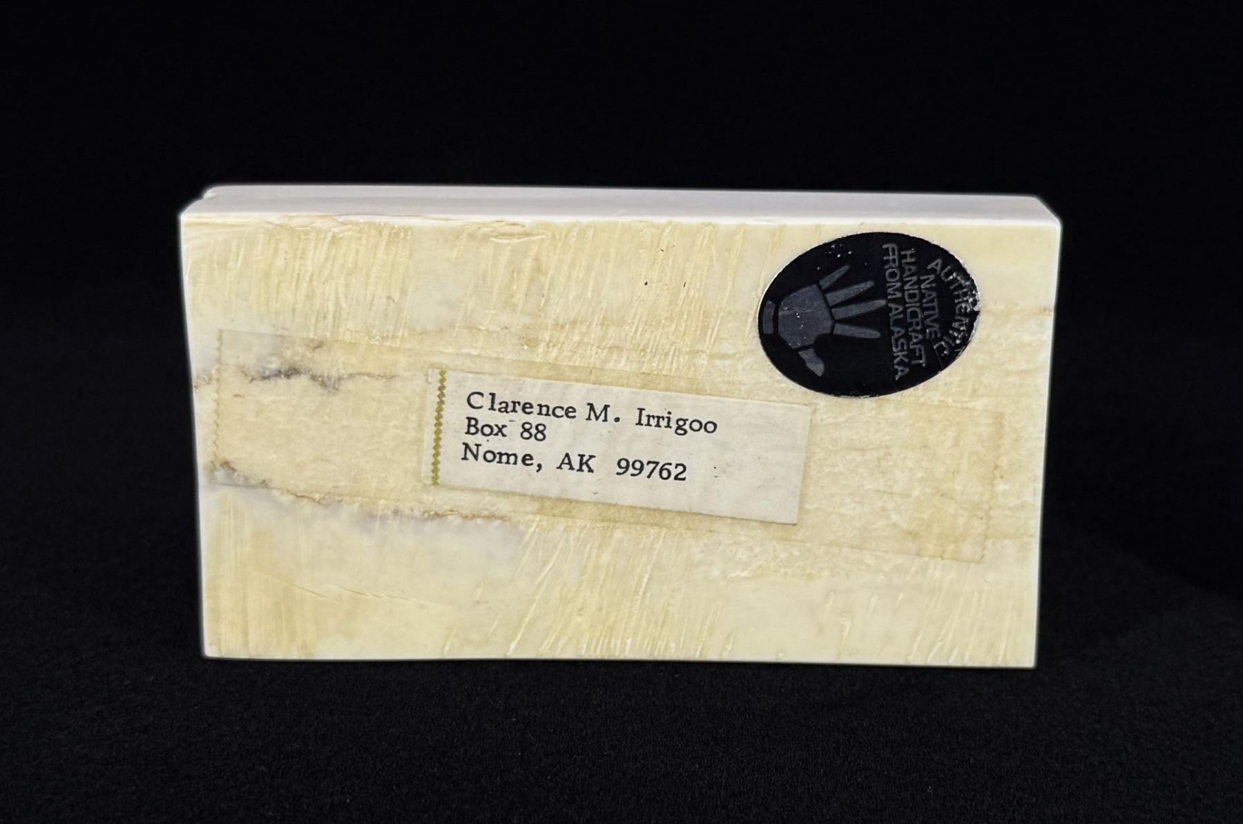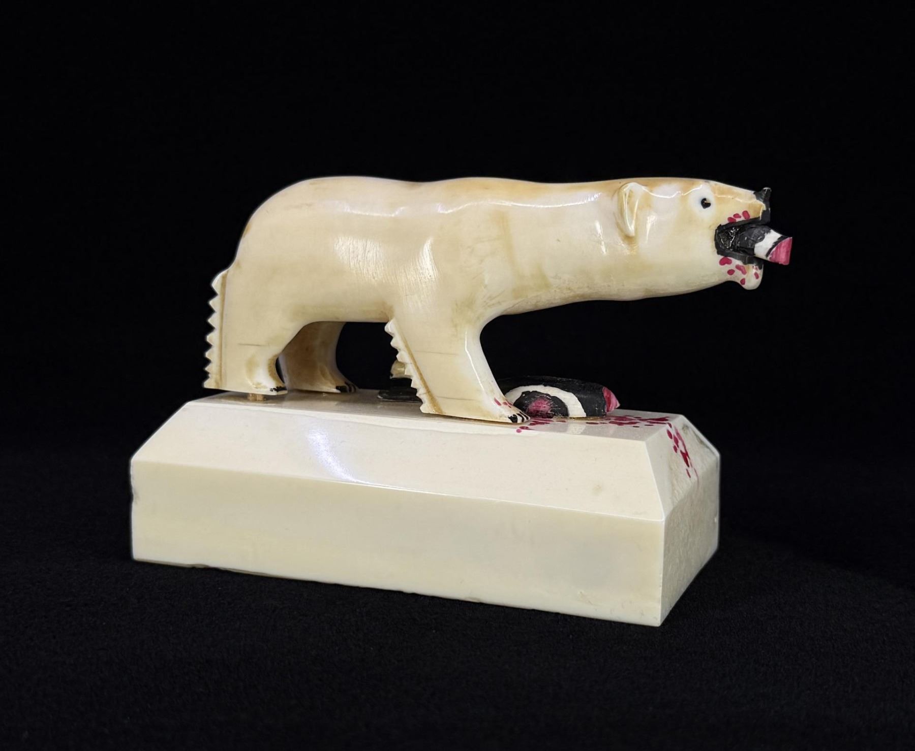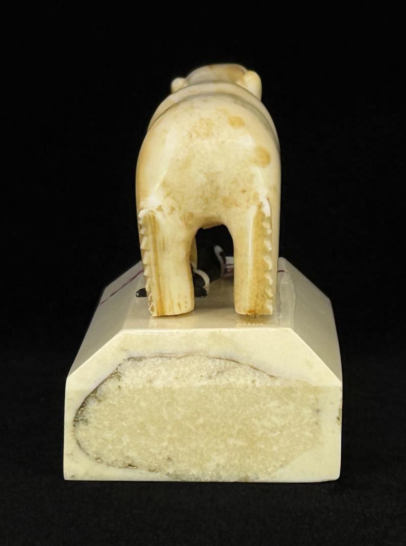 Polar Bear with Seal Head in Mouth. 4 5/8" by 2 3/4" by 2 1/8". Pegs holding carving to stand need replacement. Carved Walrus Ivory. Native made prior to 1972. This item cannot be shipped to Oregon, California, Hawaii, New York, New Jersey, Internationally, or any other state that prohibits. Provenance: Heard Museum, Arizona; Private Collection, New York. The Rev. Clarence Minglu Irrigoo Sr., affectionately known as "Big Appa," died Dec. 16, 2010, at Norton Sound Regional Hospital in Nome. His family wrote that he "went home to be with the Lord." Clarence Irrigoo Sr. was born March 14, 1914, to Samuel and Flora Irrigoo in Gambell. He married Mildred Napaqaq Walunga Irrigoo on June 1, 1935, and they had nine children. Clarence Irrigoo Sr. completed the eighth grade in Gambell, back in the years when that was the highest grade you could attain. He self-acquired his high school training using books that he ordered from Sears Roebuck & Co. Clarence also attended vocational training in SBA at the William E. Beltz Voc Ed center in Nome from October 1965 to May 1966. Clarence self-trained and taught amateur radio; he also copied world news press coming out of KNX Los Angeles at 60 wpm with a typewriter. In Gambell, Clarence Irrigoo Sr. served as a marriage commissioner, U.S. notary public and Selective Service registrar. Clarence served in the Alaska Territorial Guard, the Army National Guard, and was a member of the Ground Observer Corps, U.S. Air Force, during World War II. He was honorably discharged from all branches of service. Clarence Irrigoo Sr. was a commissioned lay preacher and Sunday school superintendent for the Presbyterian Church from 1940 to 1965. He was a member of the Nome Presbyterian Church from 1965 until his recent passing. Clarence Irrigoo Sr. was a respected elder, orator and Alaska Native leader.