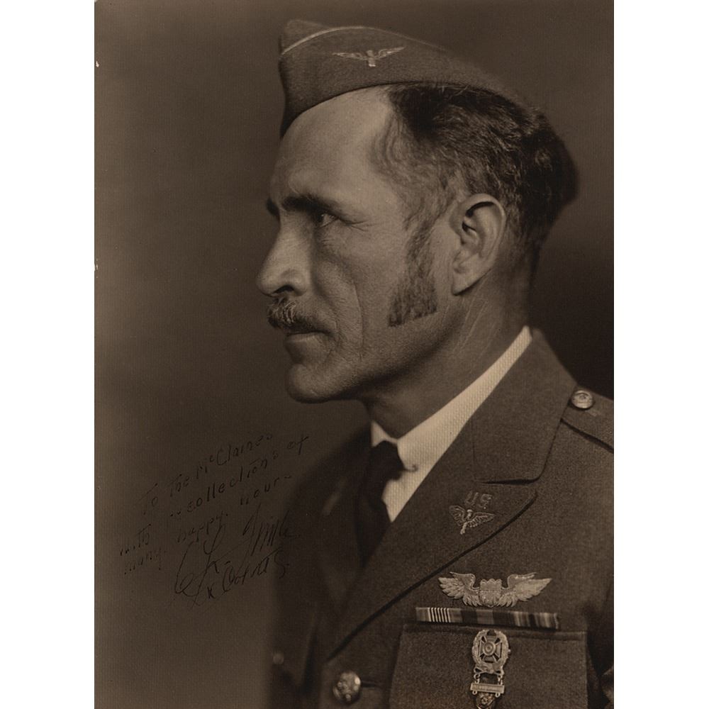 The first U.S. Army general officer (1887–1942) to be killed in World War II when his plane crashed during the Battle of Midway. Tinker was the highest ranking Native-American officer (as a member of the Osage Nation), and the first to reach that rank. During World War II, he had been assigned as Commander of the Seventh Air Force in Hawaii to reorganize the air defenses. Vintage matte-finish 9.5 x 13.25 portrait photo of Clarence Tinker in profile wearing his military uniform, signed and inscribed in black ink, "To the McClaines, with recollections of many happy hours, C. L. Tinker, Lt. Col. U.S.” In fine condition.