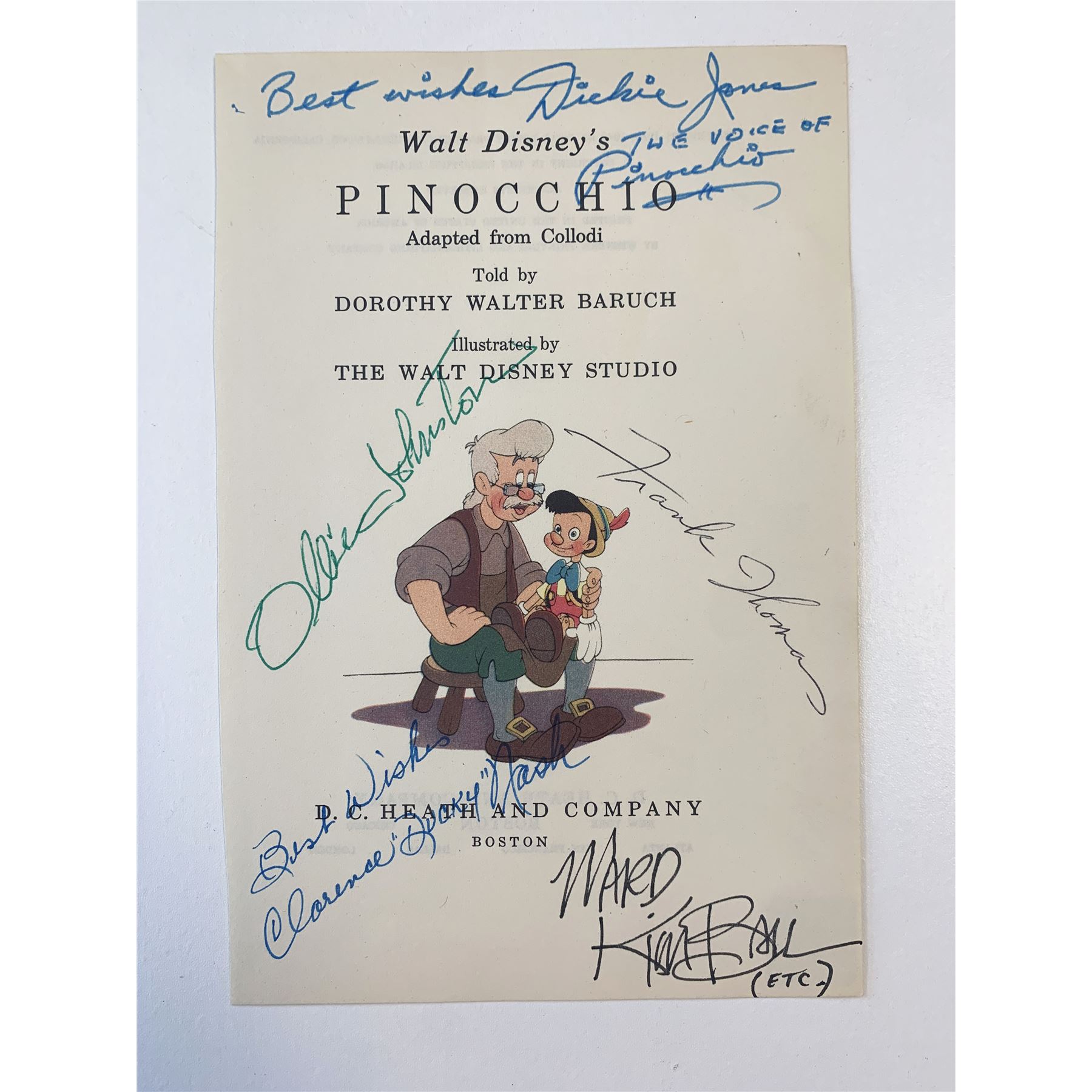 Pinocchio cast signed book page autographed by Dickie Jones, Ollie Johnston, Frank Thomas, Clarence Nash and Ward Kim Ball. 5x8 inches