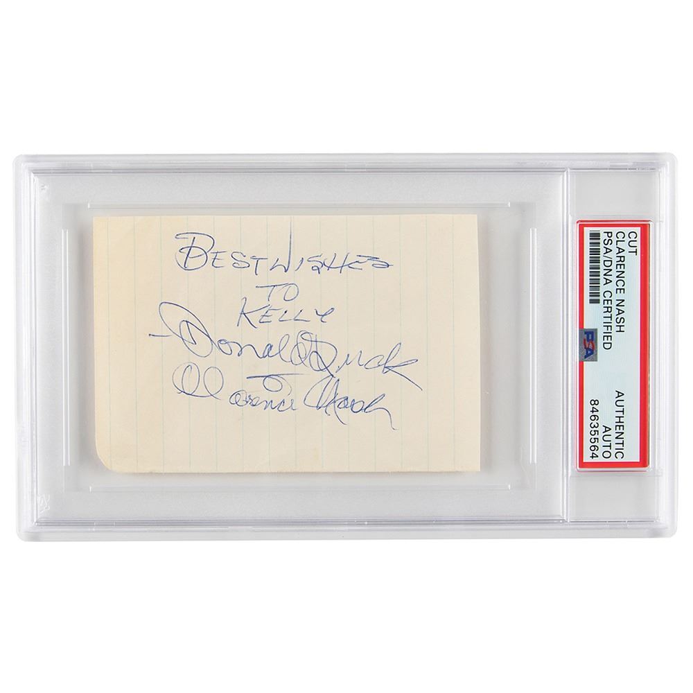 Ballpoint signature and inscription, "Best wishes to Kelly, Donald Duck & Clarence Nash,†on an off-white 4.25 x 2.75 lightly lined sheet. In fine condition. Encapsulated in a PSA/DNA authentication holder.