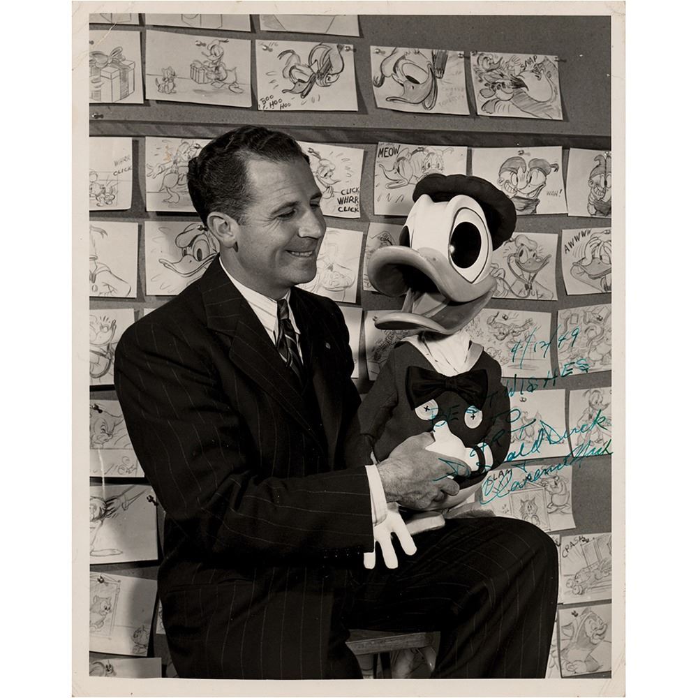 Vintage glossy 8 x 10 photo of the legendary voice actor holding a large Donald Duck puppet in front of a wall filled with storyboard drawings, signed and inscribed in bright blue fountain pen, "4/12/49, Best wishes to Art, Donald Duck & Clarence Nash.†In very good to fine condition, with scattered light creasing.