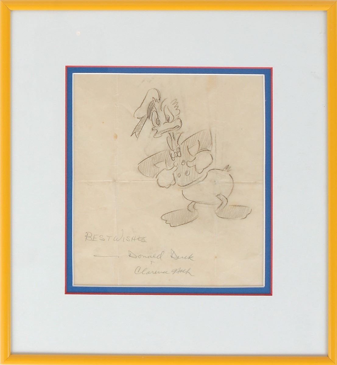 Original signed pencil full-length sketch of an upset Donald Duck on an off-white 6.75 x 7.5 sheet, signed in black ballpoint, “Best wishes—Donald Duck & Clarence Nash.” Double-matted, framed, and in very good condition, with intersecting folds and moderate overall creasing.