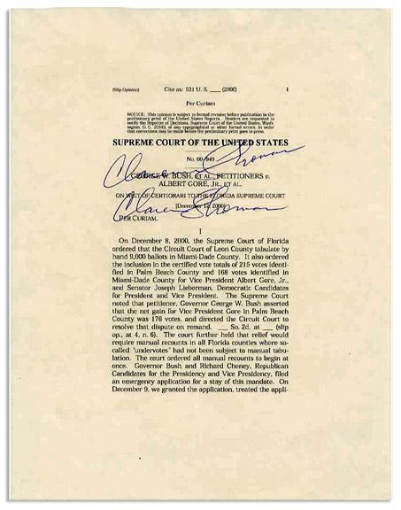 Clarence Thomas signed U.S. Supreme Court majority opinion for the historic Bush v. Gore decision. Signed twice boldly on first page ''Clarence Thomas'' in blue ink. Thirteen page document measures 8.5'' x 11''. Near fine condition.
