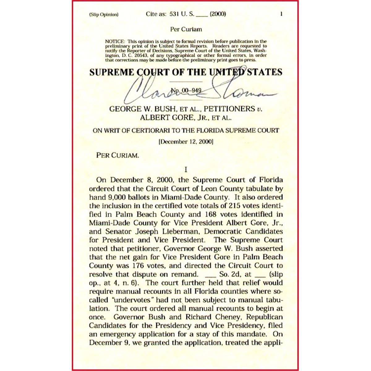 Thirteen page copy of the U.S. Supreme Court decision on the historic 2000 presidential election signed boldly by Justice Clarence Thomas on title page. Measures 8.5'' x 11''. Fine condition.