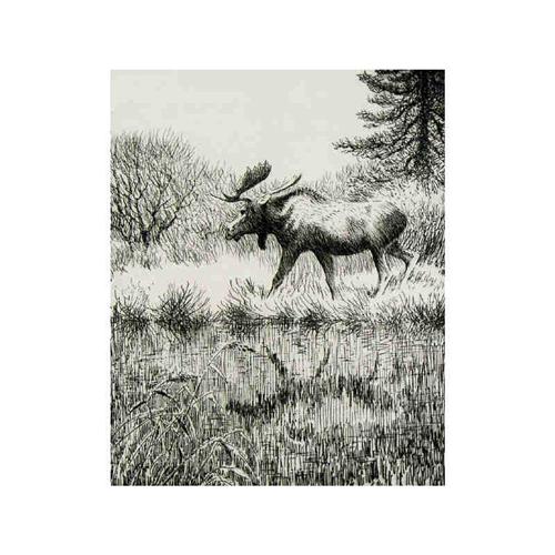 [Canadian b. 1913] WALKING BULL MOOSE AND COW Etching on paper; Ed. #35/50 6.5 x 9.75 in. BULL MOOSE AND REFLECTION