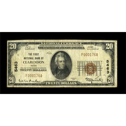 <B>Clarendon, TX</B></I> - $20 1929 Ty. 1 <B>The First NB</B></I> Ch. # 5463<BR> A tough note from the only bank to issue in this small panhandle community. <B>Fine,</B></I> ex-Ivy collection sale.<BR><BR><b>Shipping:</b> Coins & Currency (<a target="_blank" href="http://www.heritageauctions.com/common/shipping.php">view shipping information</a>)