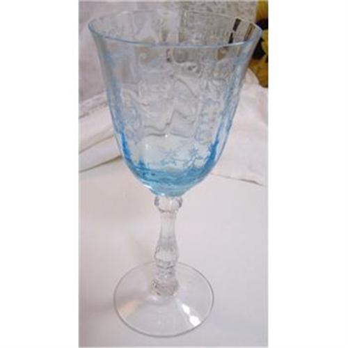 Up for your consideration is a Claret Wine Glass in Navarre Etch #327 w/Blue Top on Wilma Blank #6016 by Fostoria: