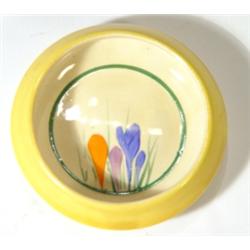 Clarice Cliff design ashtray, hand painted with crocus pattern, black Bizarre mark to back, 10cm diameter
