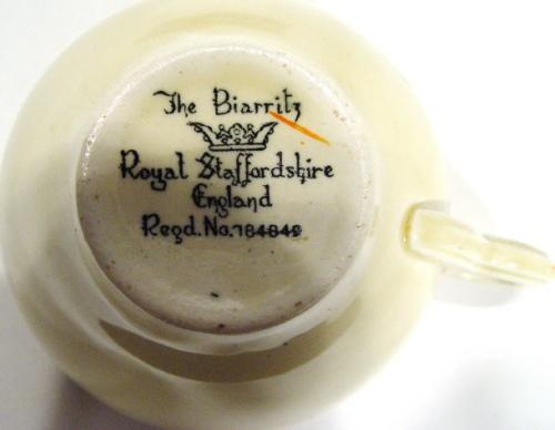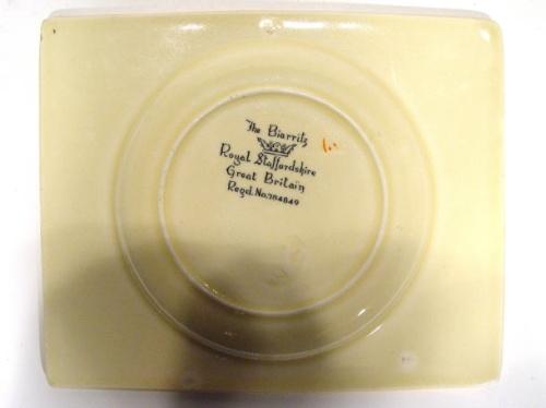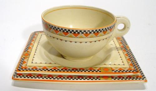 Clarice Cliff style Biarritz trio comprised cup, rectangular saucer and side plate with transfer pr