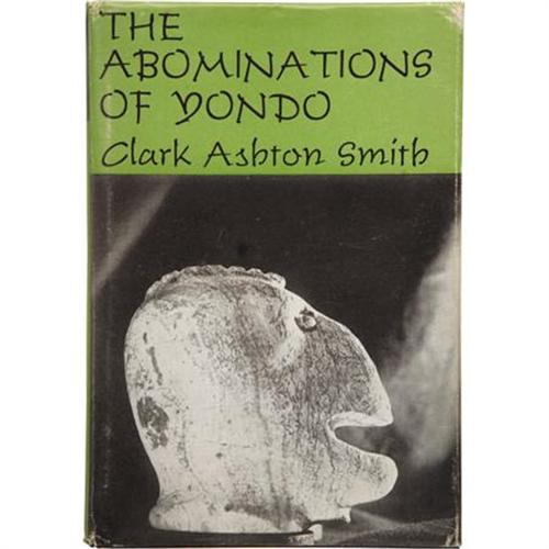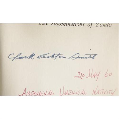 <B>Clark Ashton Smith. </B></I><B><I>The Abominations of Yondo</B></I></B></I><B>.</B></I> Sauk City, Wisconsin: Arkham House, 1960.<BR> <BR>First edition, one of a short print run of 2,005 copies signed by the author. Signed in full and inscribed on the half-title:<I> "</B></I>Abdomenal [sic] Umbilical Nativity Greetings. Dear Francine, from the most mean abominable man you know<I>."</B></I> Octavo. 227 pages. <BR><BR>The fourth collection of Smith's strange stories with jacket art by Ronald Clyne and Wynn Bullock. Black cloth binding with gilt imprinting. Jacket shows moderate wear at corners and edges; spine, covers, and text block are fine to very fine.<I> From the Robert and Diane Yaspan Collection.</B></I><BR><BR><b>Shipping:</b> Books & Catalogs (<a target="_blank" href="http://www.heritageauctions.com/common/shipping.php">view shipping information</a>)