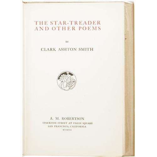 <B>Clark Ashton Smith: Signed<I> The Star-Treader and Other Poems.</B></I></B></I> (San Francisco: A. M. Robertson, 1912), first edition, 100 pages, signed by the author and dated the year of publication on the ffep, tan boards with gilt titles and decoration, fore and bottom edges untrimmed, 8vo (5.5" x 8"), light foxing to endpapers, else near fine in a toned near fine jacket. The author's first book and scarce in jacket. <I>From the Ventura Collection.</B></I><BR><BR><b>Shipping:</b> Books & Catalogs (<a target="_blank" href="http://www.heritageauctions.com/common/shipping.php">view shipping information</a>)