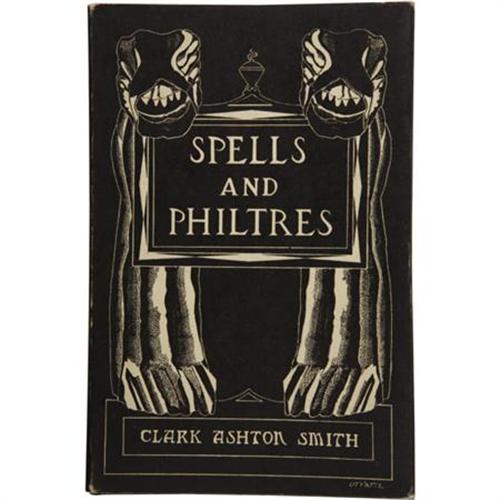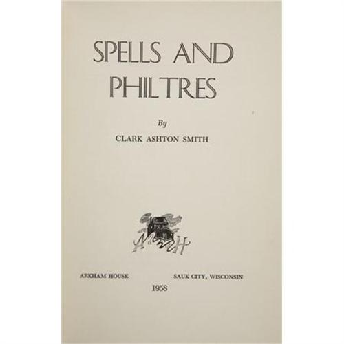 <B>Clark Ashton Smith. </B></I><B><I>Spells and Philtres</B></I></B></I><B>.</B></I> Sauk City: Arkham House, 1958.<BR><BR>First edition. Twelvemo. 54 pages. <BR><BR>Publisher's original black cloth with titles in gilt on the spine. A beautiful copy, slightly toned at the pastedowns and endpapers. Dust jacket illustrated by Frank Utpatel with minor shelf wear at the extremities and back panel slightly toned. A fine copy. <I>From the Robert and Diane Yaspan Collection.</B></I><BR><BR><b>Shipping:</b> Books & Catalogs (<a target="_blank" href="http://www.heritageauctions.com/common/shipping.php">view shipping information</a>)