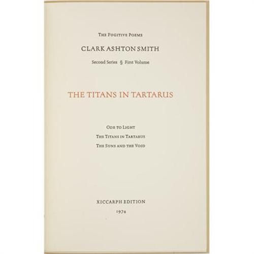<B>Clark Ashton Smith. </B></I><B><I>The Titans in Tartarus</B></I></B></I><B>.</B></I> [No place, CA]: Siana Literary Enterprises, Inc., 1974.<BR> <BR>First edition of the Xiccarph edition limited to 320 copies hand-numbered on a limitation page at back. Quarto. Unpaginated.<BR><BR>Sewn tan wraps with titles in orange on the front cover, in the original envelope as issued. Fine. A selection of three poems by Smith, the first volume in his <I>Fugitive Poems</B></I> series. <I>From the Robert and Diane Yaspan Collection.</B></I><BR><BR><b>Shipping:</b> Books & Catalogs (<a target="_blank" href="http://www.heritageauctions.com/common/shipping.php">view shipping information</a>)
