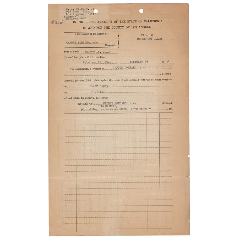 Partly-printed DS, one page, 8.5 x 14, March 4, 1942. Delmar Mote Florist, as "a creditor of Carole Lombard, etc., deceased‰Û_presents its claim against the estate of said deceased, with the necessary vouchers, to Clark Gable as Executor of said estate," in the amount of $420.76. Gable approves the claim, signing on a reverse docketing panel. In fine condition, with light irregular toning and some short edge tears. Gable and Lombard were married for three years until her untimely death in a plane crash, a loss from which Gable never truly recovered.