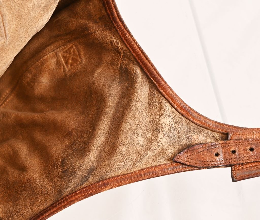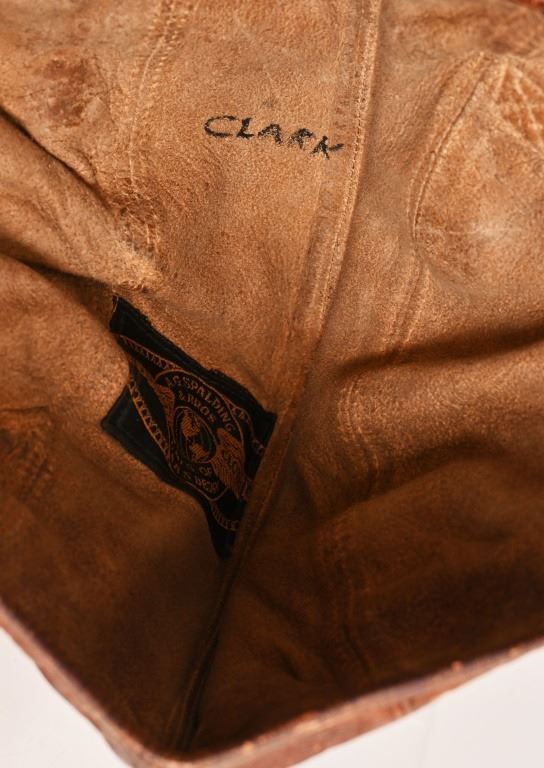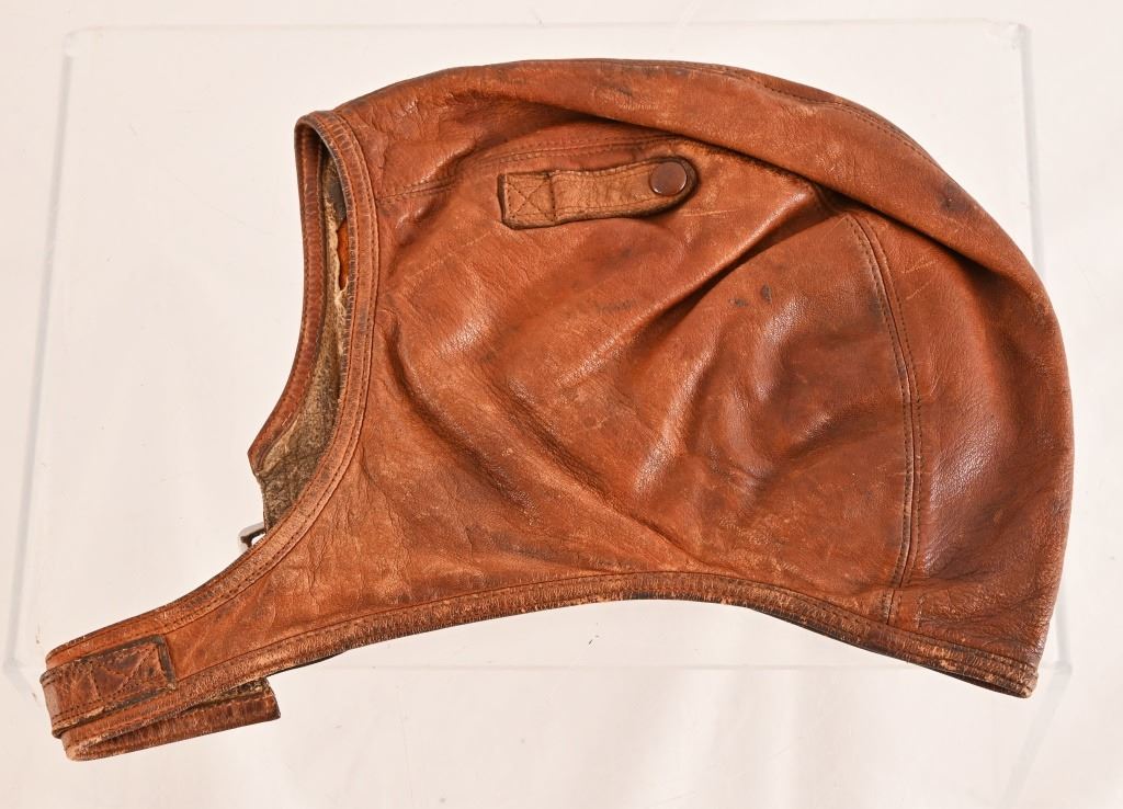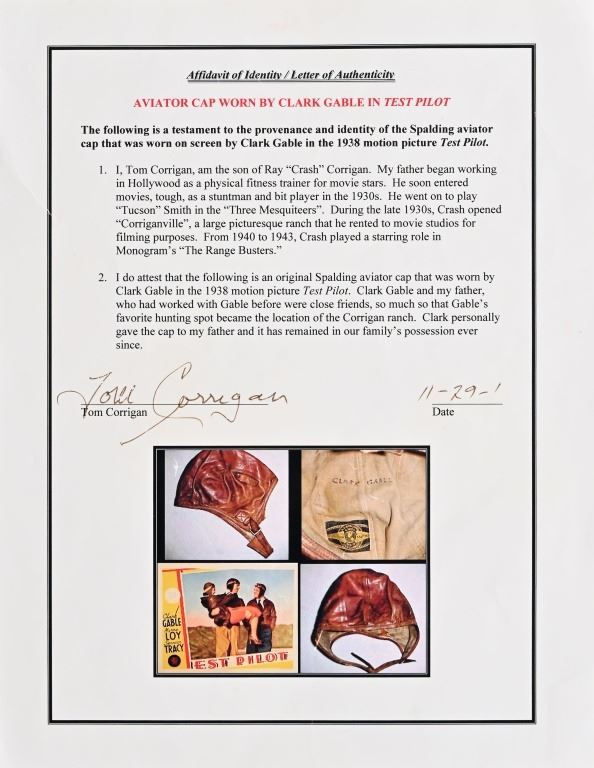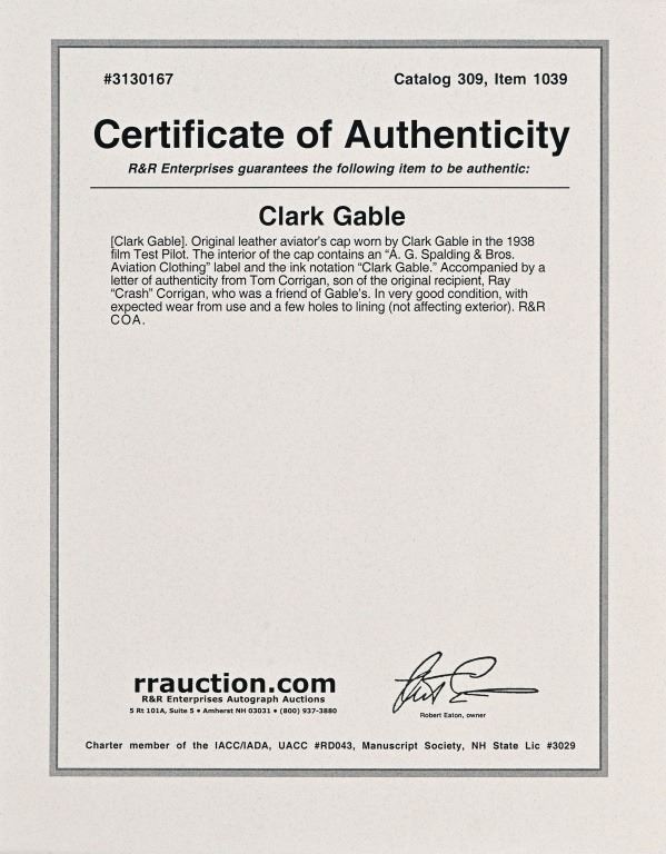 Original leather aviator cap worn by Clark Gable in "Test Pilot" 1938. Interior of cap contains an "A.G. Spalding & Bros. Aviation Clothing" label and ink notation "Clark Gable". Comes with COA